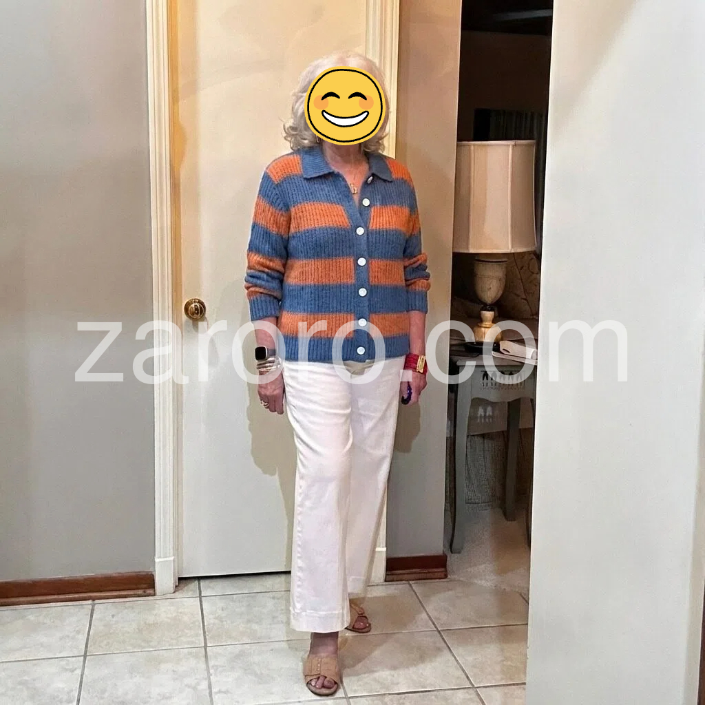 This cardigan is such a comfortable fit for everyday outings during the changing seasons. The blue and orange horizontal stripes look nice in person, and the collar frames my face really well. I can button it up without feeling tight or bulky, which is exactly what I wanted for daily wear.
