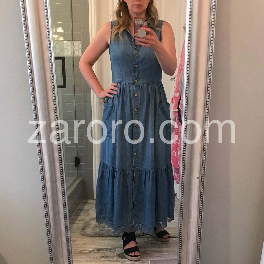 Crafted from premium denim, this sleeveless maxi dress combines timeless style with modern versatility. The flattering V-neckline and button-front closure create a refined silhouette that transitions effortlessly from casual daytime wear to evening occasions. The full-length cut offers elegant coverage while the structured denim fabric ensures durability and shape retention. Perfect for layering with jackets or cardigans, this wardrobe essential delivers both comfort and sophisticated appeal.