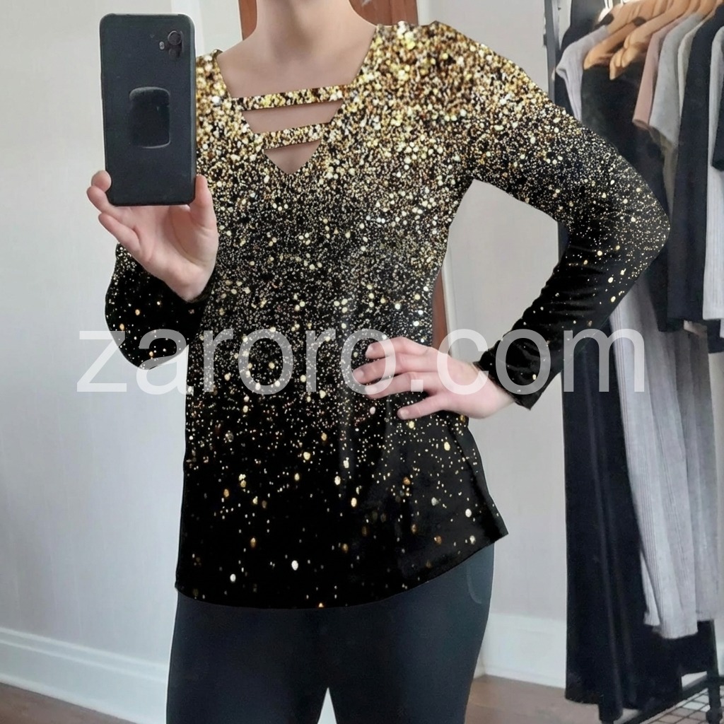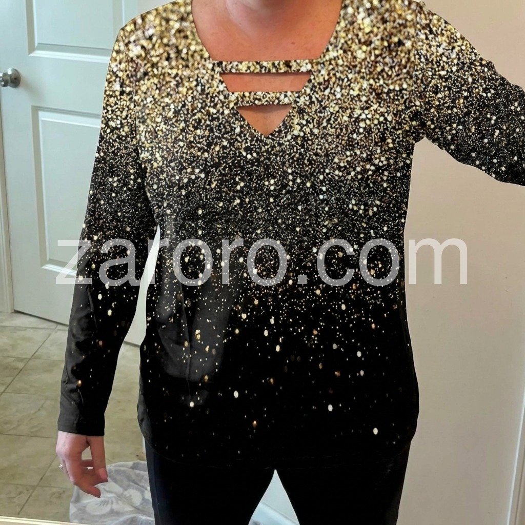 Just in time for your next glam holiday vacay! This sultry, strappy caged shirt has a v-neckline that awaits your favorite layering necklaces or statement jewels. This unique long-sleeved top sparkles with a generous sprinkle of metallic ombre silver and gold print, perfect for pairing with jeans or black slacks, boots, and metallic heels. Machine wash cold tumble dry low to medium heat. Iron if needed or lay flat to dry.
