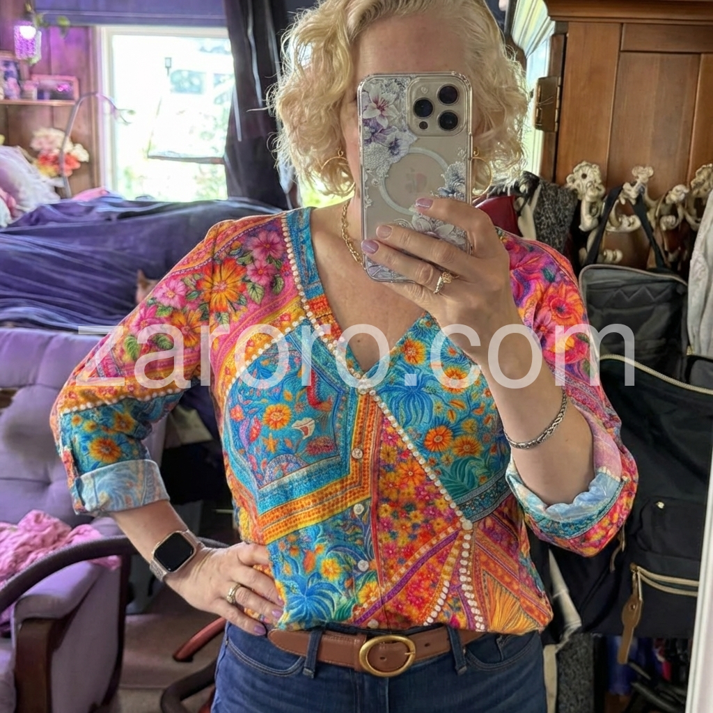 This boho-inspired top features a bold, multi-colored floral and geometric print with rich blues, pinks, yellows, and oranges. The V-neck design and front button closure add a classic touch to the vibrant pattern. Three-quarter sleeves with rolled cuffs offer a relaxed fit. Perfect for casual outings, beach days, or festival wear. Lightweight fabric ensures comfort and effortless style.