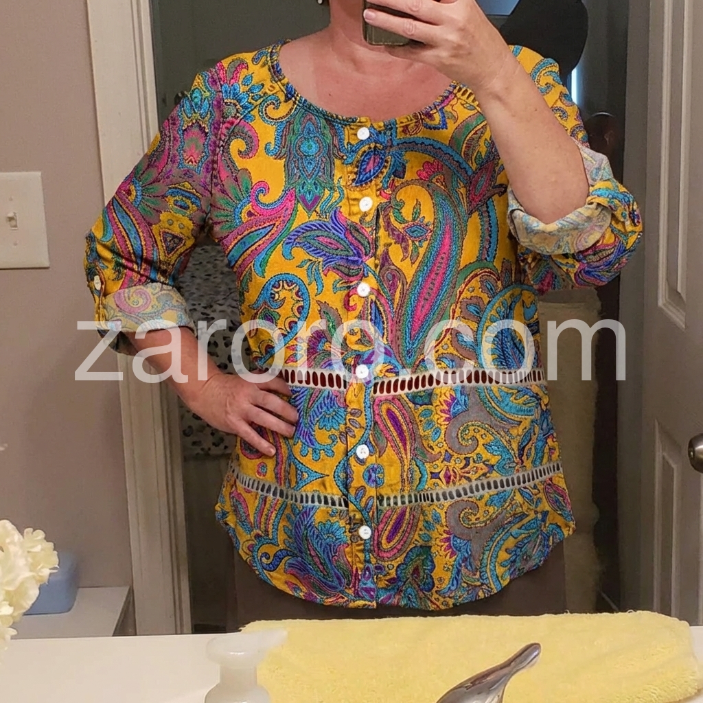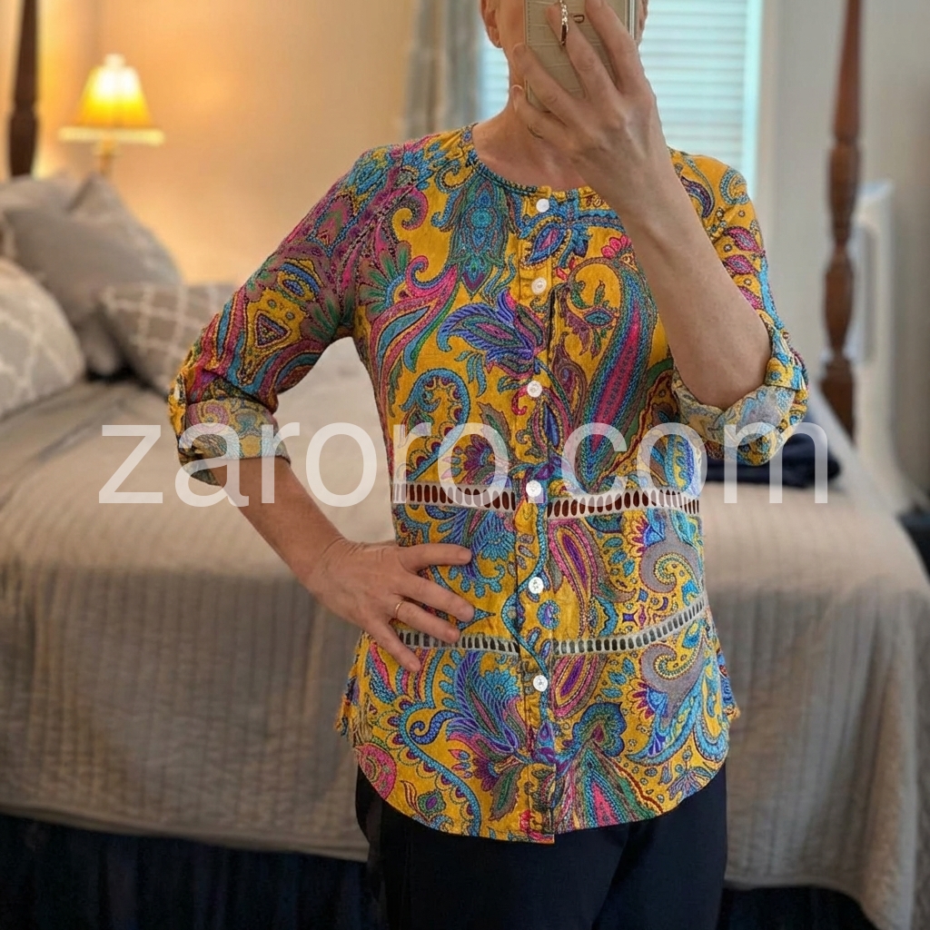 This long-sleeve tunic features a rich yellow base with colorful paisley patterns. The front button design adds vintage charm. Relaxed fit and rolled sleeves for comfort. Perfect for casual wear or bohemian styles. Pair with jeans or leggings for effortless flair.