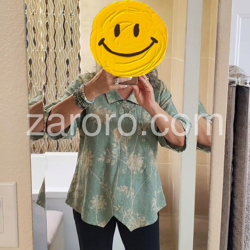 This shirt is so unique! The diagonal buttons add such a cute touch, and the dandelion floral print gives it a lovely boho vibe. I wore it with jeans and received so many compliments. It fits true to size and is very comfortable.