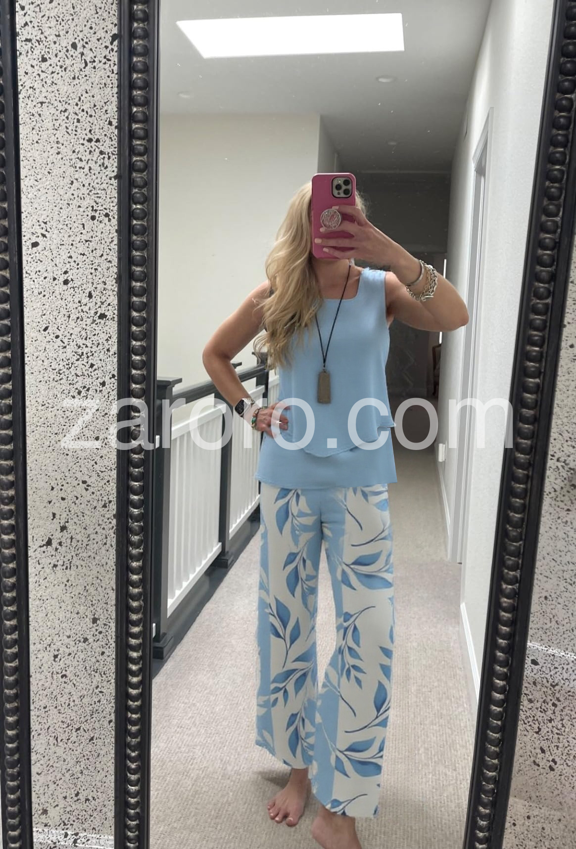 Blue Plant Print Square Neck Two Piece Set