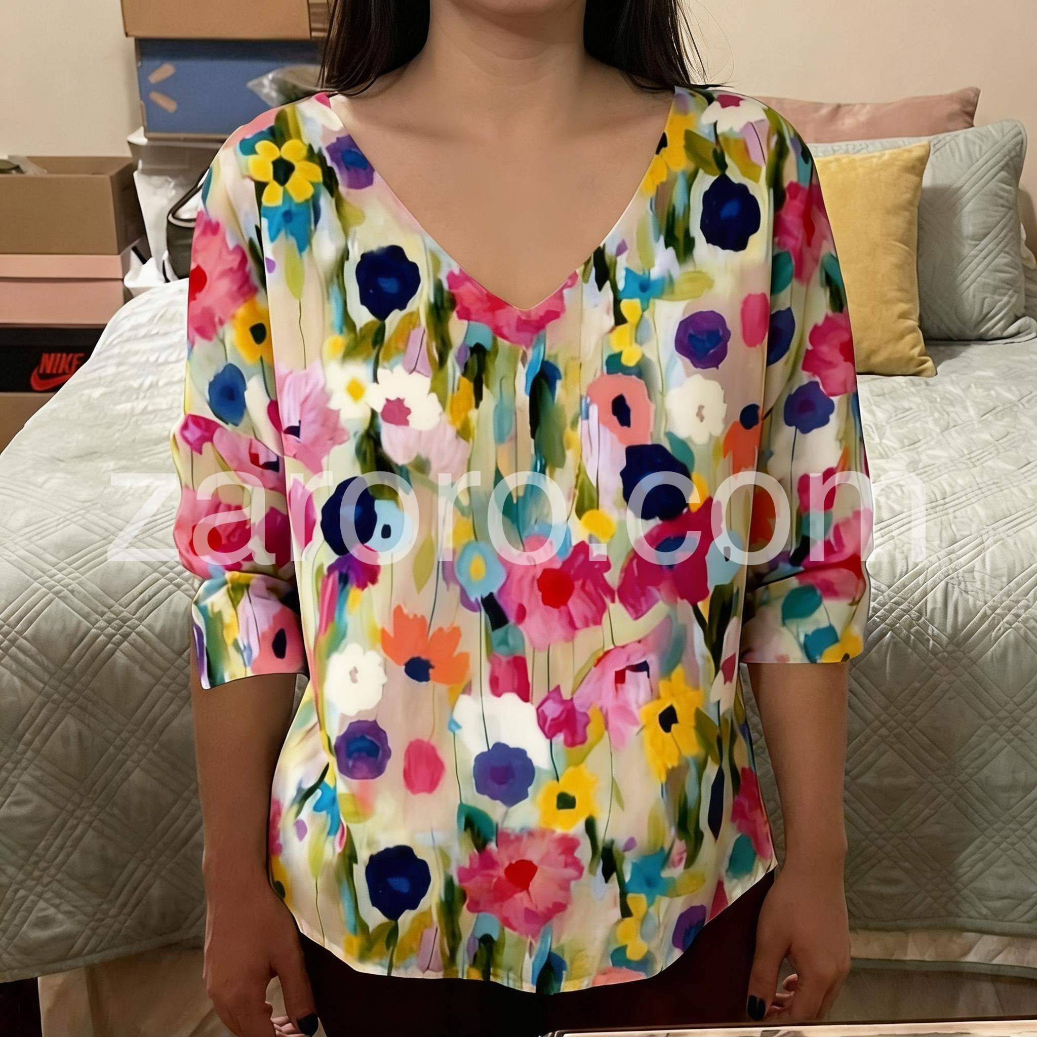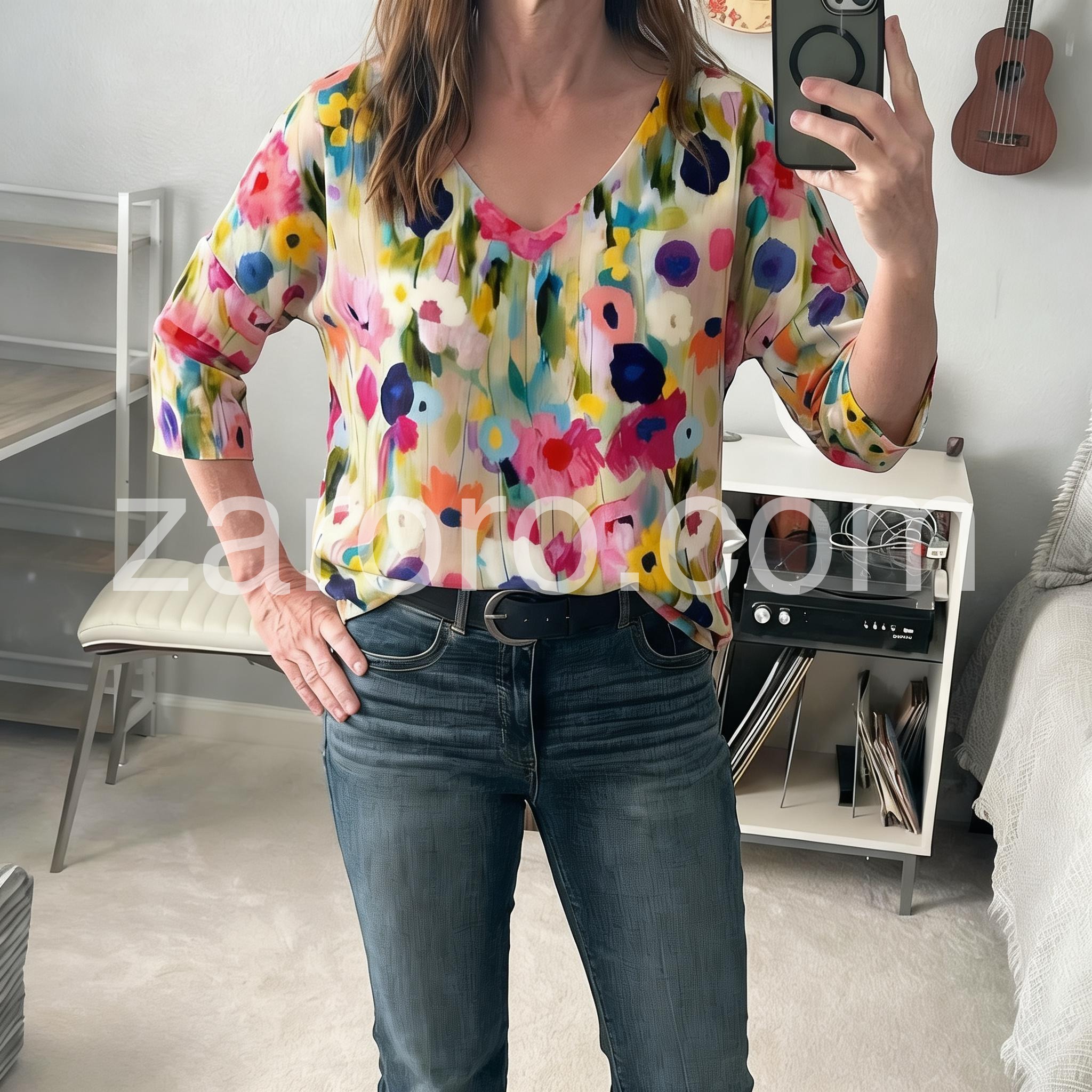 This flowy top features a colorful watercolor floral print on a soft beige base. Deep V-neckline and three-quarter sleeves with rolled cuffs. Lightweight fabric perfect for warm weather. Ideal for casual wear or beach outings. Effortlessly stylish and full of summer spirit.