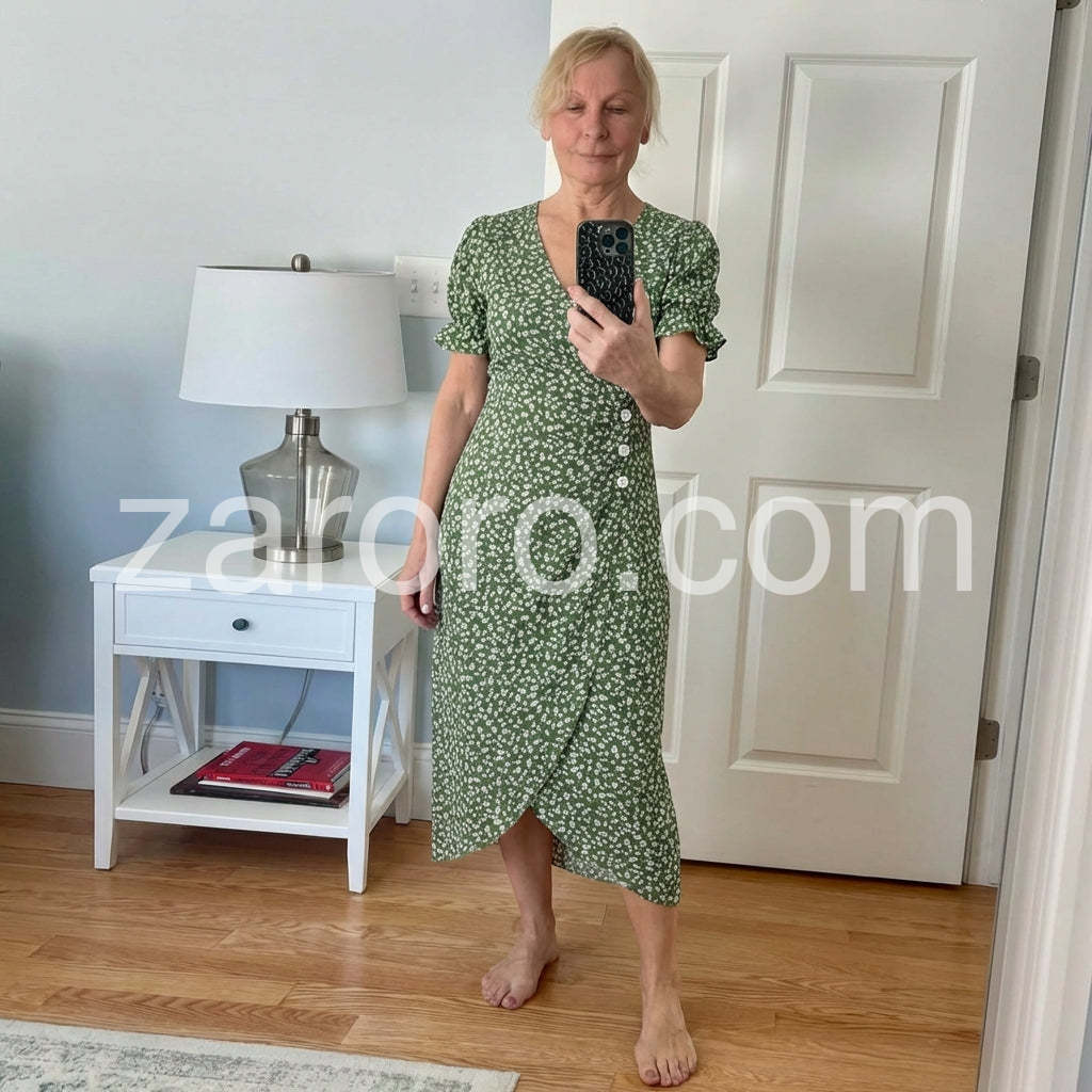 Get ready for summer with this sage green midi dress. Short sleeves with pleats on the front and buttons give it a cinched bodice and detail. The v-neck complements your favorite layering necklaces, accentuated by the mid-calf silhouette with an uneven hem. Finish your look with sandals, heels, or wedges.