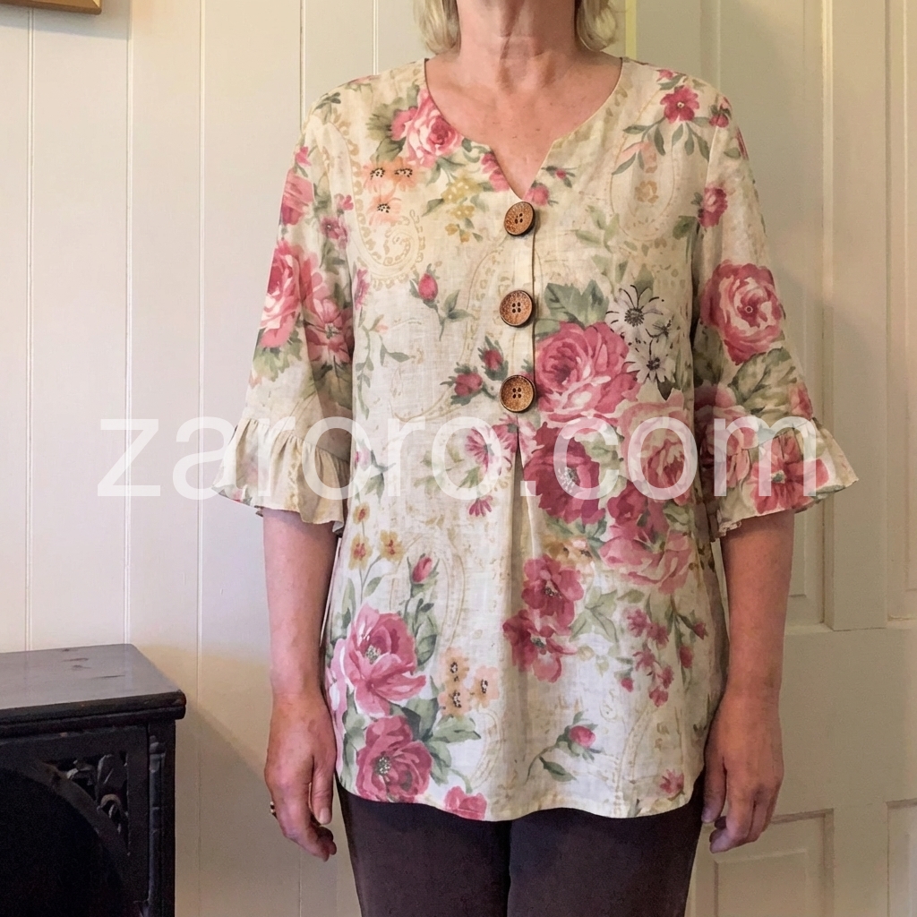 This lightweight blouse features a soft floral print with pink roses on a cream base. V-neckline with wooden buttons down the front. Flared three-quarter sleeves with ruffle details. Perfect for spring or summer outfits. Effortlessly feminine and relaxed.