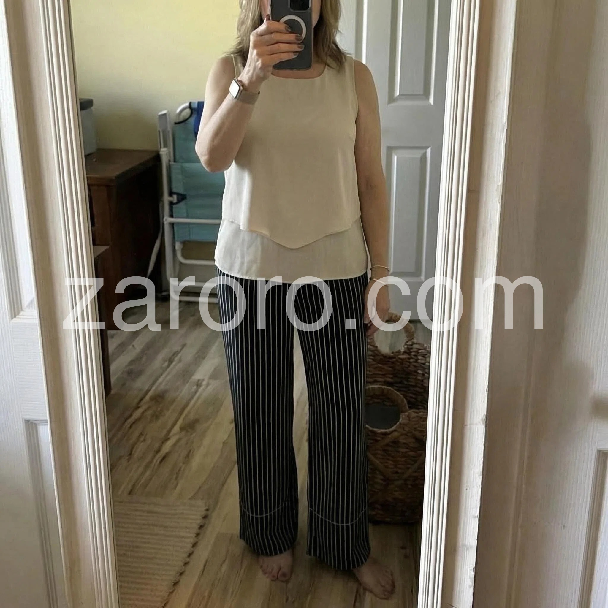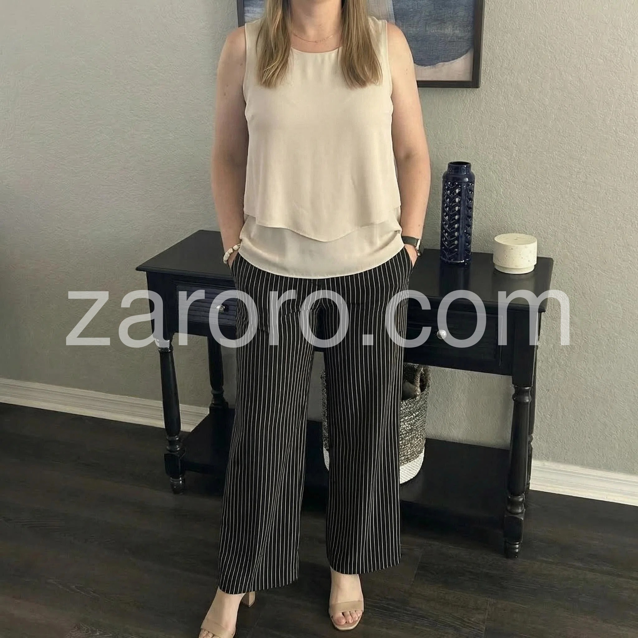 This two-piece set features a sleeveless beige top with a layered hem and square neckline. Paired with high-waisted black wide-leg pants in thin white stripes. Comfortable fit with a chic, relaxed silhouette. Perfect for casual outings or smart-casual events. Effortlessly stylish and easy to wear.