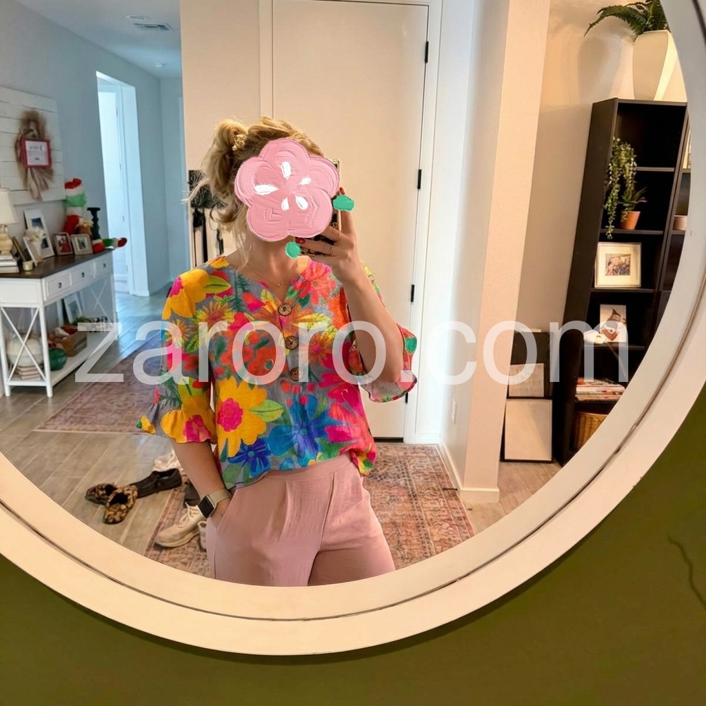 Hey fashion fam, this blouse is a VIBE that fixes your "boring daily top" pain point! Tired of tops that are too plain or too flashy? The vibrant, oversized floral print adds a bold pop of color, while the notched V-neck flatters all necklines.