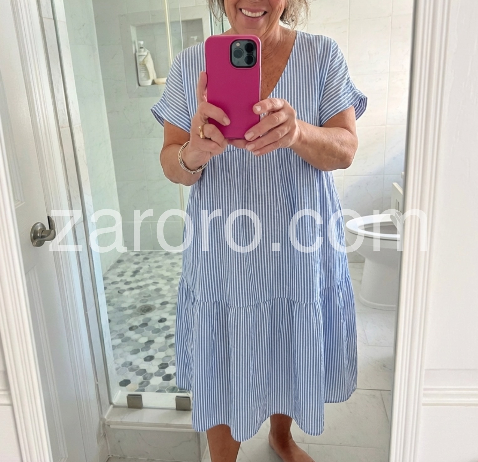 This Youthful Striped Print V-Neck Midi Dress is designed for the modern fashion-forward woman. Made with a flattering V-neckline and eye-catching striped print, this dress is versatile and perfect for any occasion. Its midi length adds a touch of elegance, while the youthful design adds a playful touch. Elevate your wardrobe with this must-have dress.