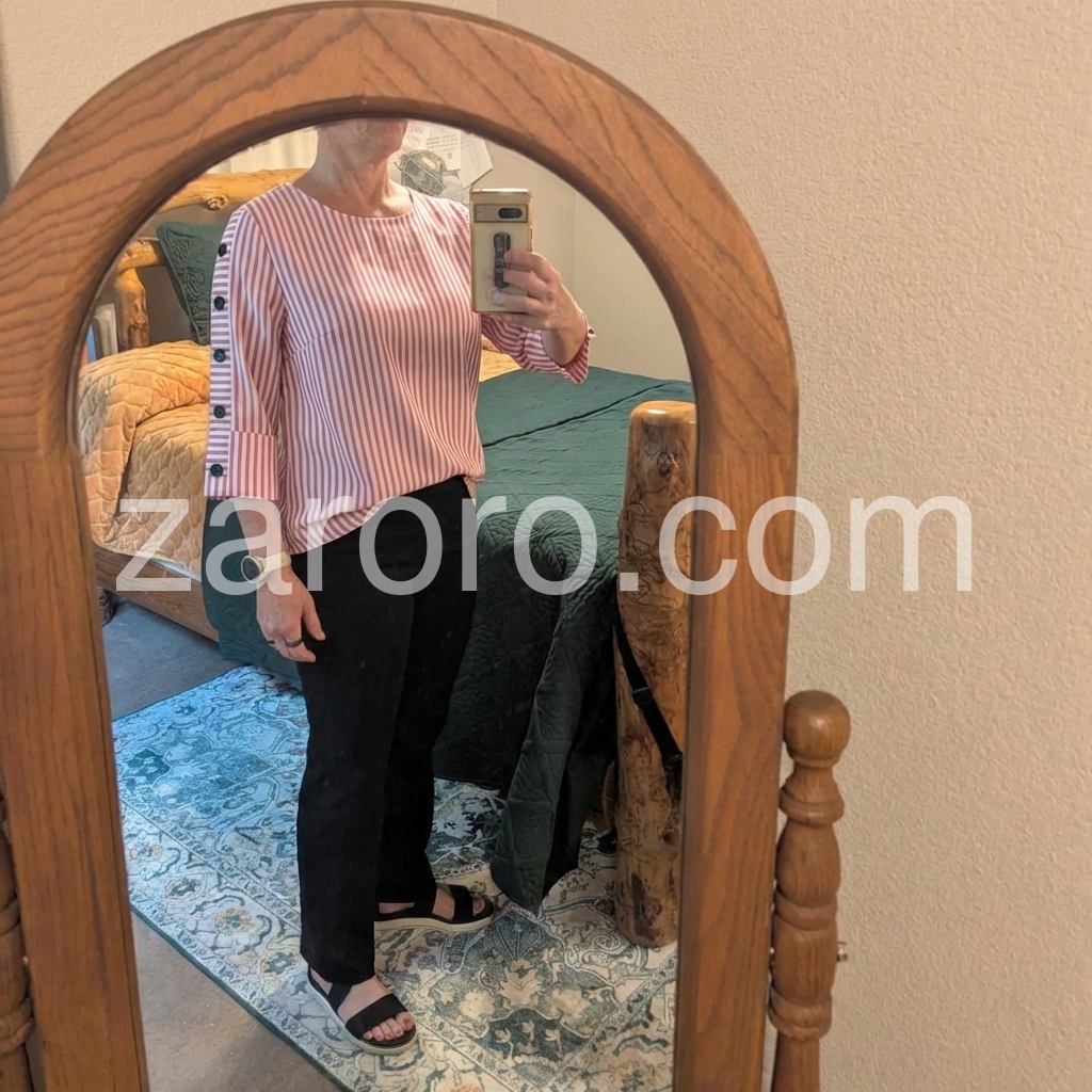 his loose-fit top features vertical pink and white stripes with stylish button details on the sleeves. Three-quarter sleeves with rolled cuffs offer a relaxed look. Round neckline for a clean, comfortable fit. Perfect for casual wear or smart-casual outfits. Bright and cheerful with a touch of elegance.