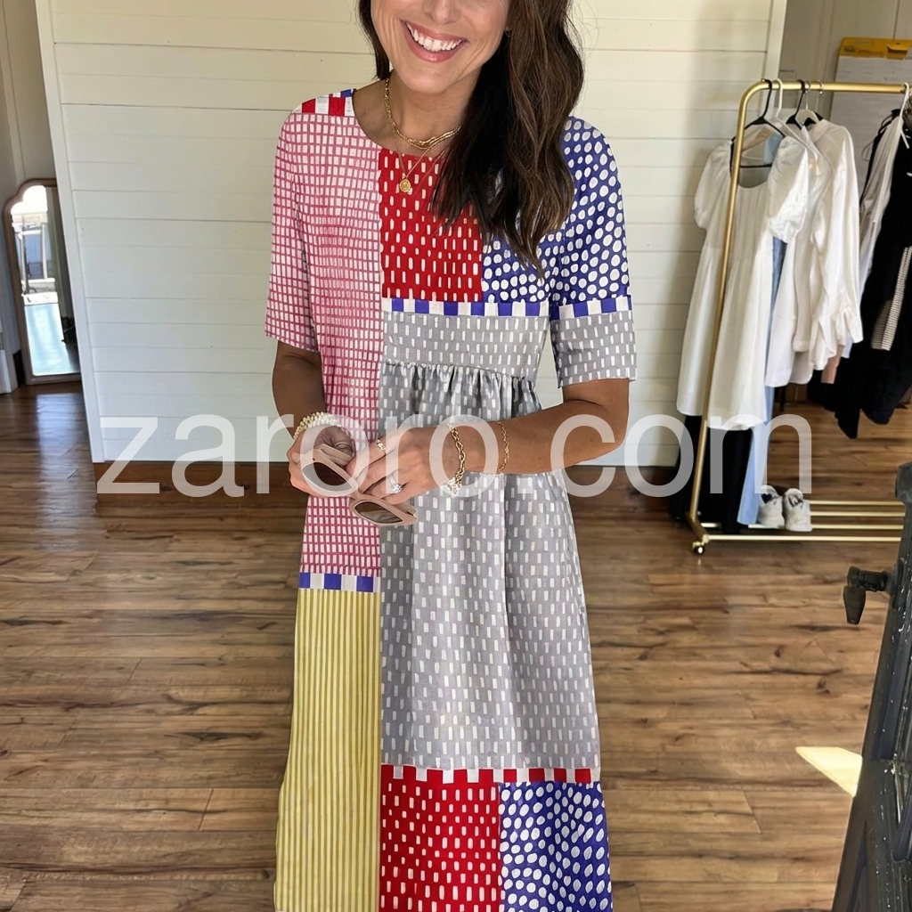 The bold, multicolored geometric patchwork print makes a striking statement, while the gathered waist and pockets add comfort and function.