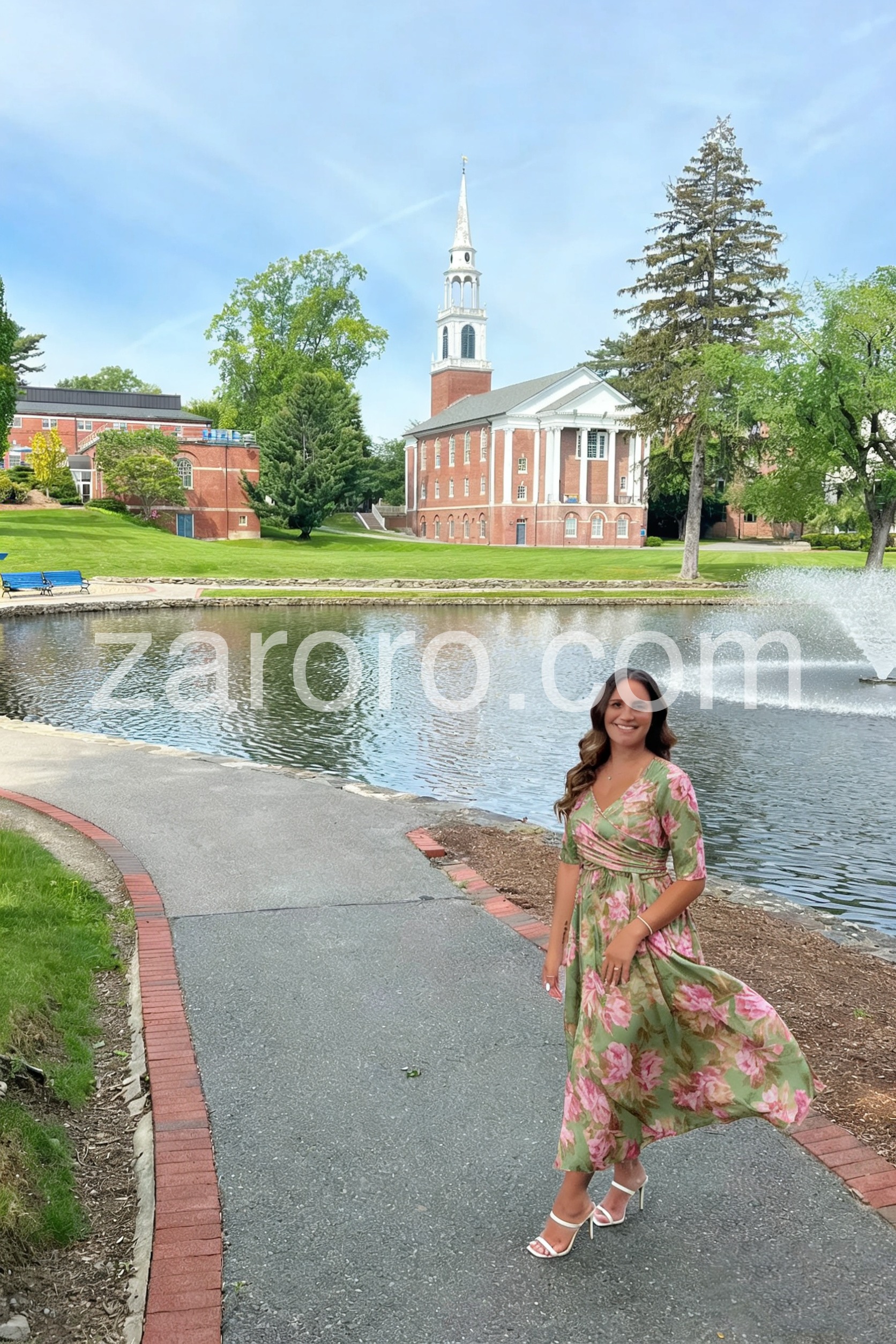 This wrap-style midi dress features a lush green base with soft pink rose prints. The V-neck and short sleeves create a graceful silhouette. Side pockets add comfort and convenience. Lightweight fabric perfect for warm days. Ideal for garden parties or casual outings.