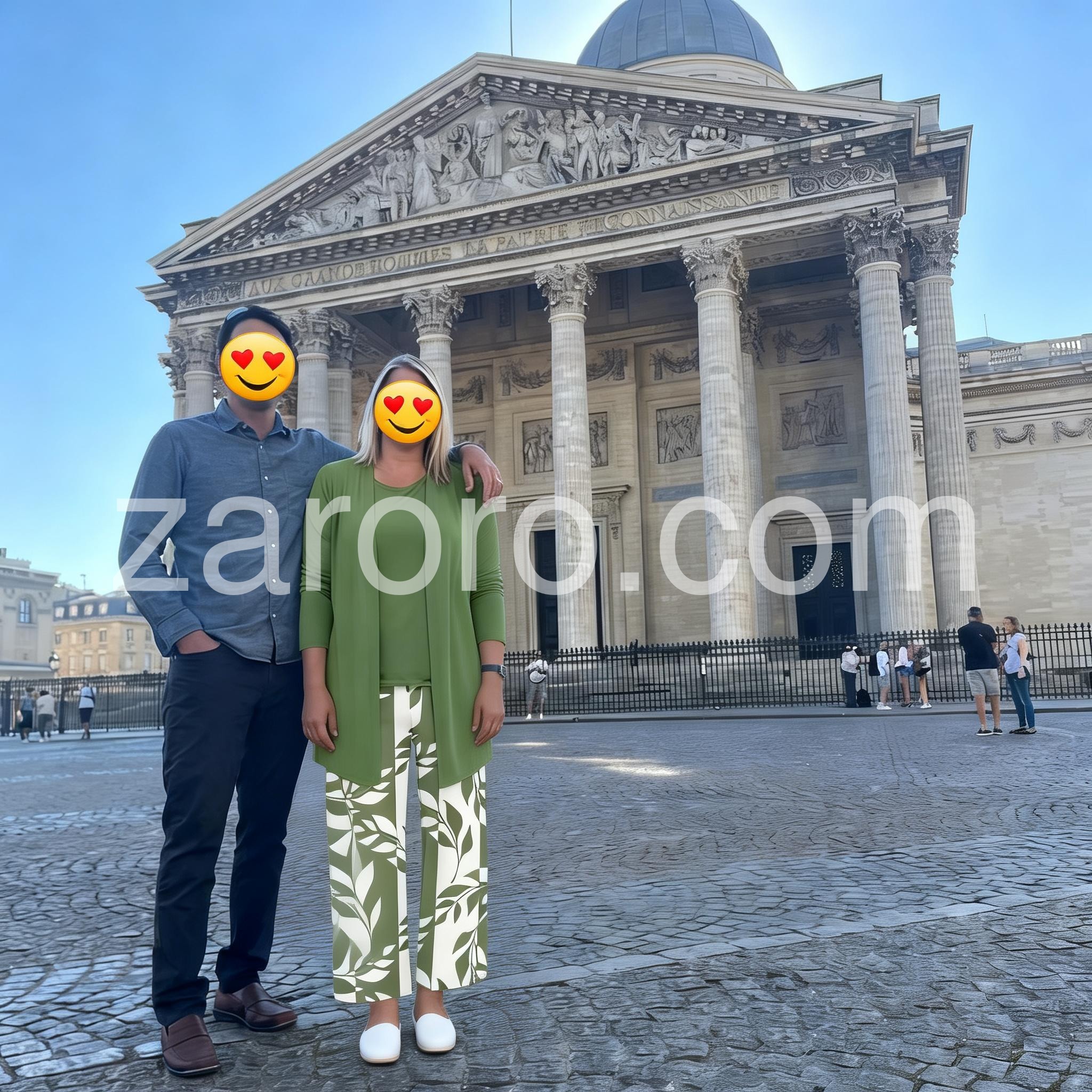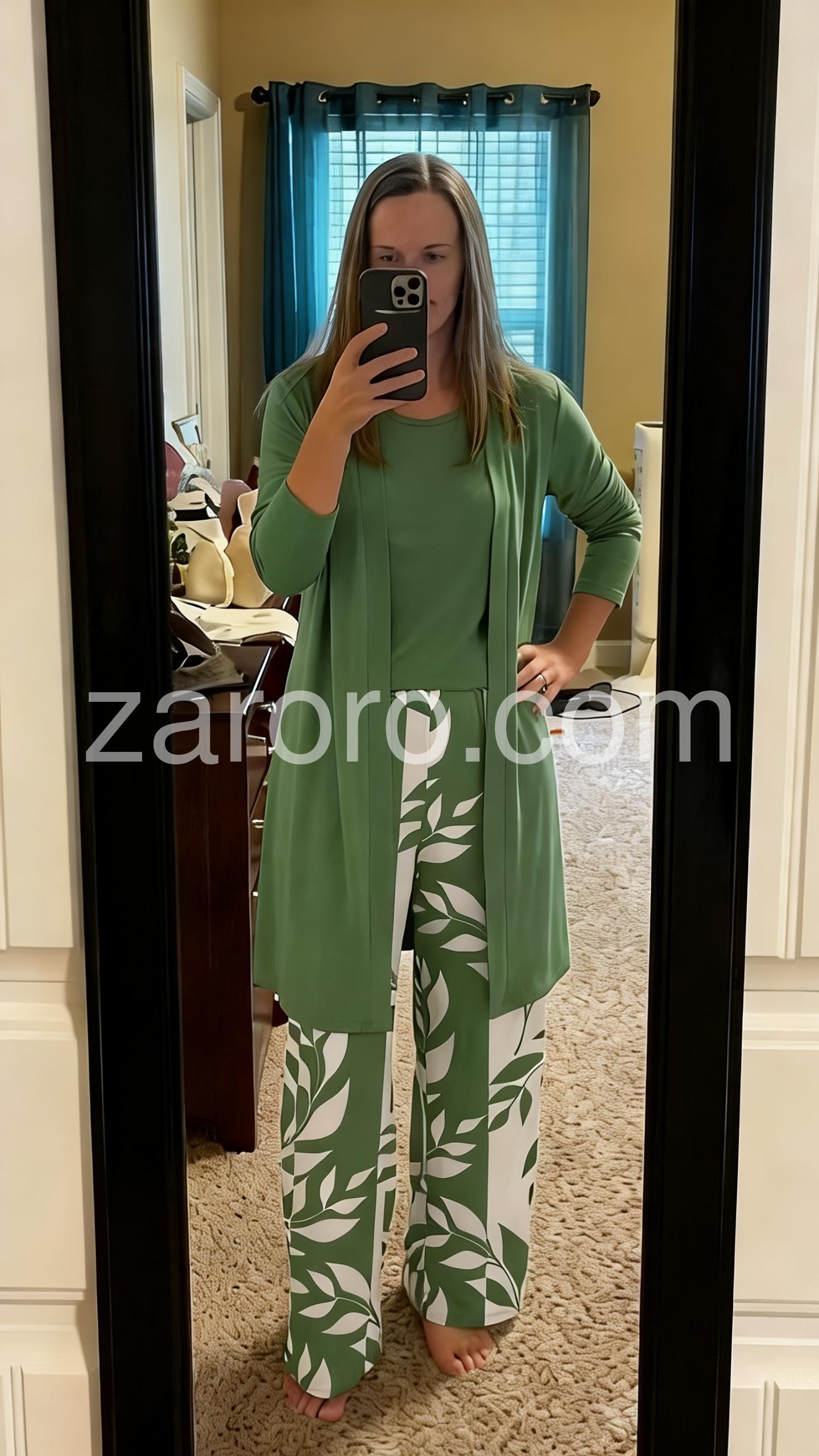This three-piece set features leaf-patterned wide-leg pants in white and green, paired with a solid green top and open-front cardigan. The relaxed fit offers comfort and elegance. Perfect for casual outings or smart-casual events. Lightweight fabric ideal for warm weather. Effortlessly chic and easy to wear.