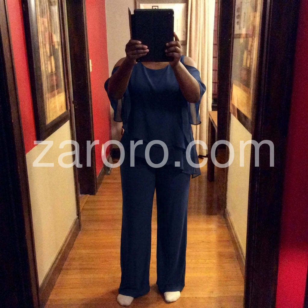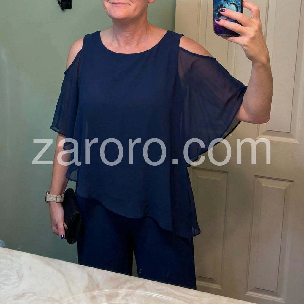 This fashionable two-piece set includes a navy cold shoulder three-quarter length draped sleeves and asymmetrically layered ruffled top and pants. Crafted from lightweight and soft materials, this set is perfect for any occasion. Step up your look with this stylish set.