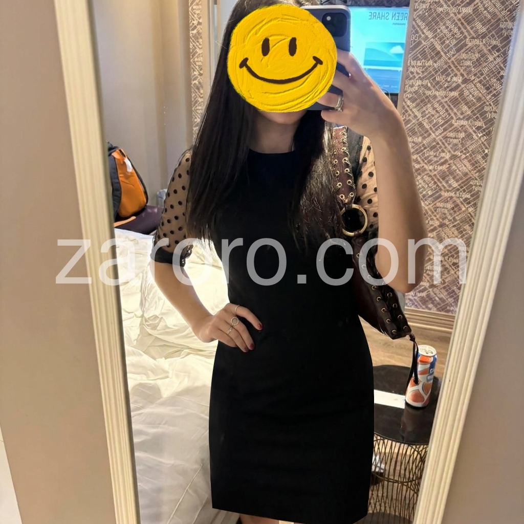 This dress solves the “I want something polished with a subtle twist” dilemma. The classic black sheath silhouette is flattering and timeless, while the sheer polka dot mesh sleeves add a playful, modern touch. The solid black cuffs keep the look grounded.