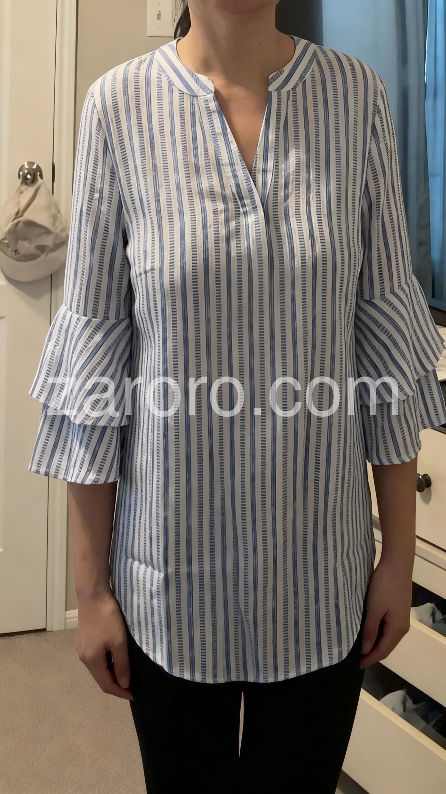 This V-neck top features vertical blue and white stripes with a relaxed, flowy silhouette. The dramatic ruffle sleeves add a feminine touch. Lightweight fabric perfect for warm weather. Pair with jeans or shorts for a breezy, beach-ready look. Ideal for casual summer days.