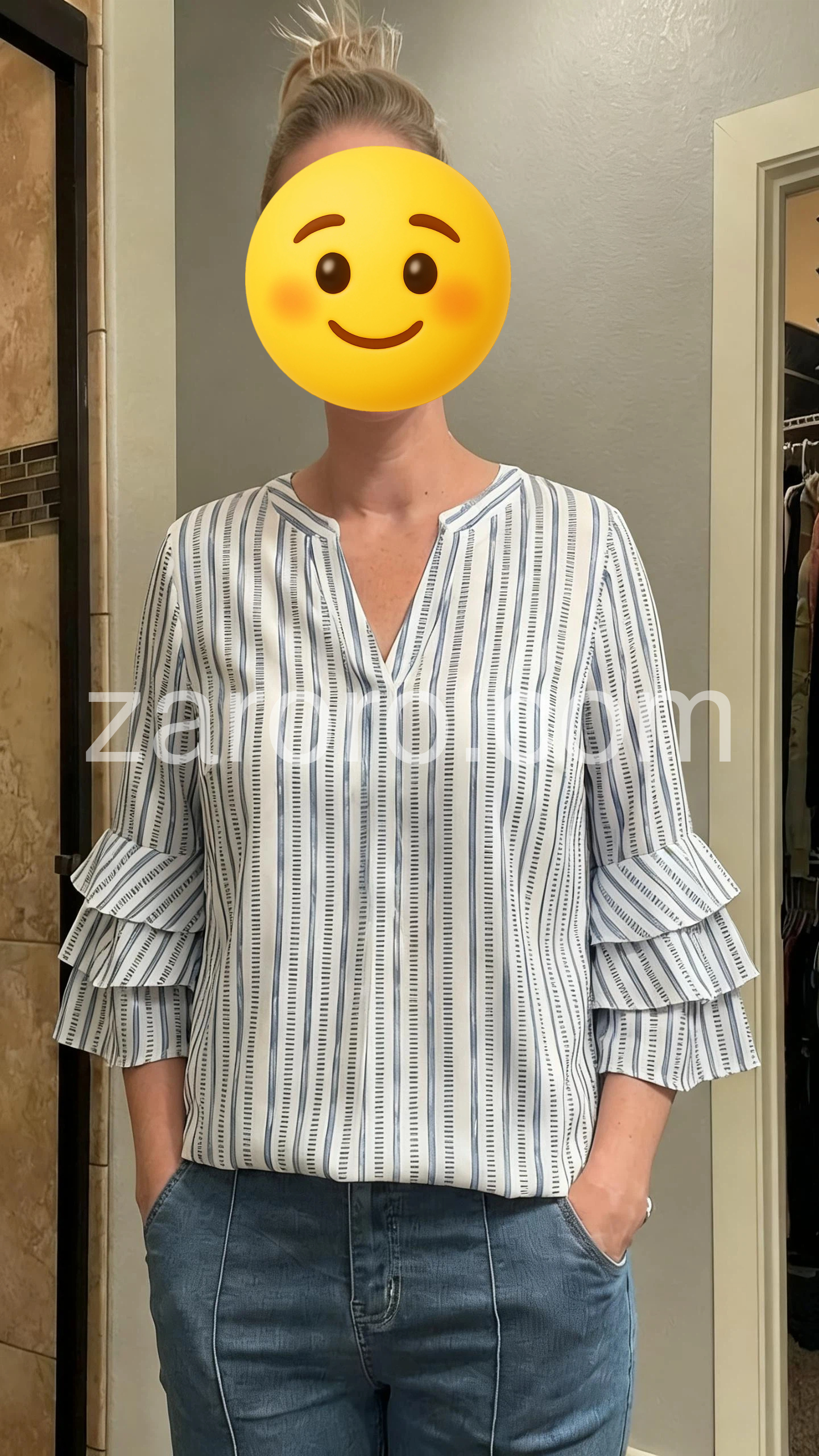 This blouse is so comfortable and flowy. The material is lightweight making it perfect for spring and summer. The vertical stripes are also very slimming. Highly recommend!