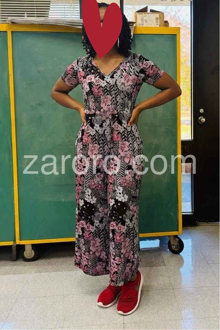 This V-neck jumpsuit features a bold floral pattern in soft pink and white on a black background. The short sleeves and wide-leg design offer a relaxed, stylish fit. Side pockets add practicality and ease. Lightweight fabric perfect for warm weather. Ideal for casual outings or summer days.
