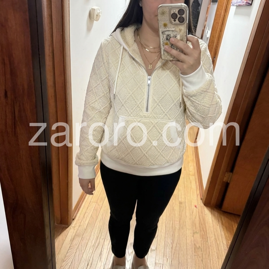 Beige Quilted Sherpa Half-Zip Hooded Sweater