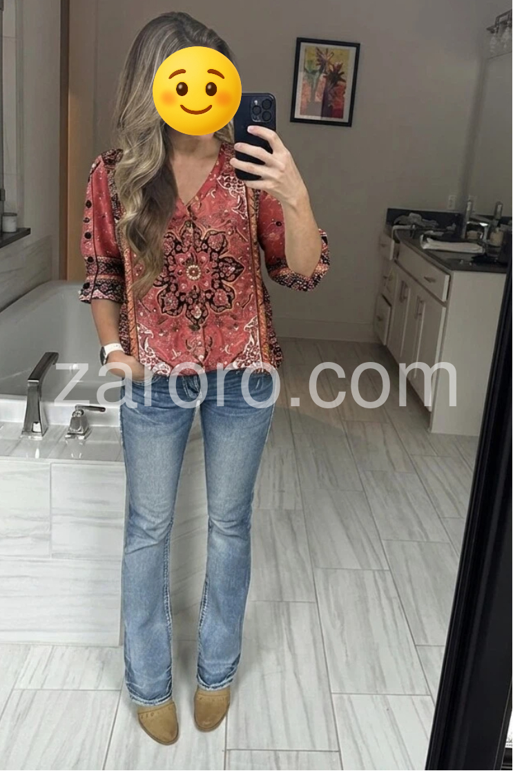 This V-neck top features a vibrant red base with an intricate mandala-inspired pattern. Button-down front and three-quarter sleeves with button cuffs add detail. Lightweight fabric for comfort and ease. Perfect for adding a bohemian flair to any outfit. Effortlessly stylish and eye-catching.