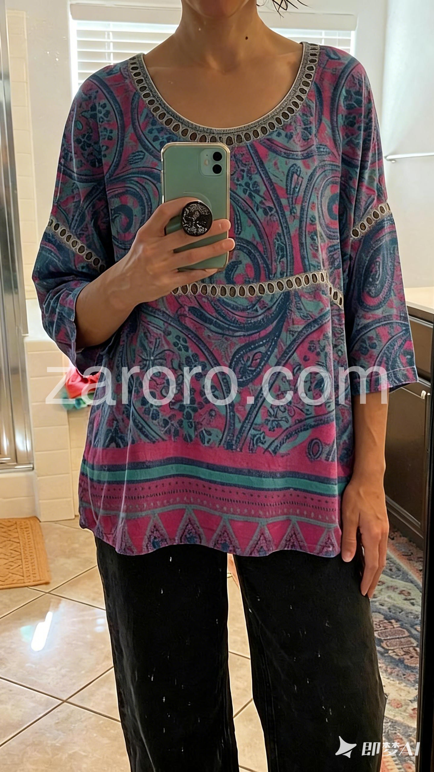Style# 1544326Embrace free-spirited fashion with this Special Paisley Print Round Neck Top, a bold and artistic statement piece that brings vibrant energy to any outfit. Crafted from soft, lightweight fabric—likely cotton or rayon blend—this relaxed-fit tunic features an eye-catching paisley pattern in rich shades of deep purple, teal, and fuchsia, accented with intricate tribal-inspired motifs. The design is elevated by delicate black circular trim along the neckline, sleeves, and waistband, adding a touch of bohemian flair and contrast. With its three-quarter sleeves and slightly asymmetrical hem, this top drapes beautifully over jeans, leggings, or skirts, making it perfect for casual outings, music festivals, or weekend adventures. Layer it with layered necklaces, bracelets, and sandals for a full-on boho look—just like in this Lulus-inspired ensemble. Ideal for those who love expressive prints and effortless style, this tunic combines comfort, color, and cultural artistry into one wearable masterpiece. A must-have for anyone craving a touch of wanderlust in their wardrobe.