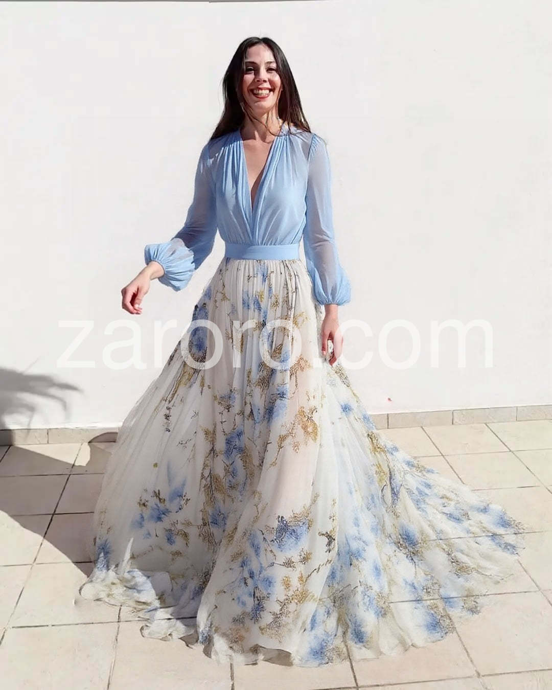 I bought this dress for a spring gala and felt absolutely beautiful! The light blue bodice and sheer sleeves are so elegant, and the floral skirt flows beautifully when you walk. Highly recommend!