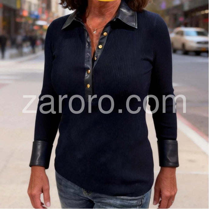 Chic Long Sleeve Faux Leather Trim Slim Fit Top