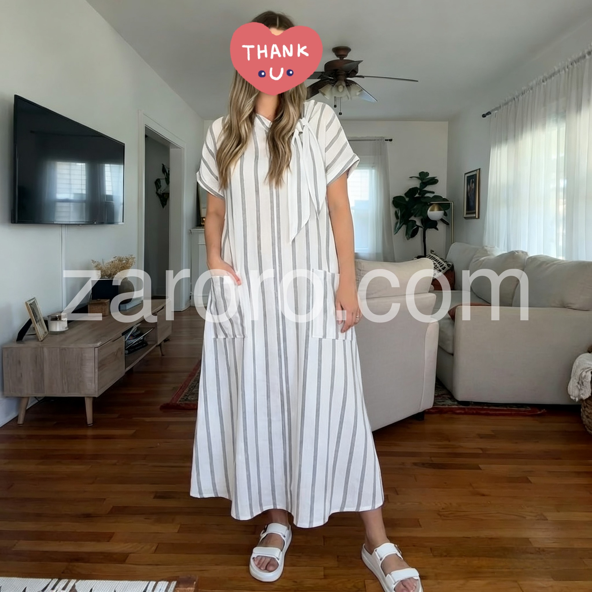 The classic vertical stripe print, twisted neck detail, and oversized pockets create a relaxed, stylish silhouette.