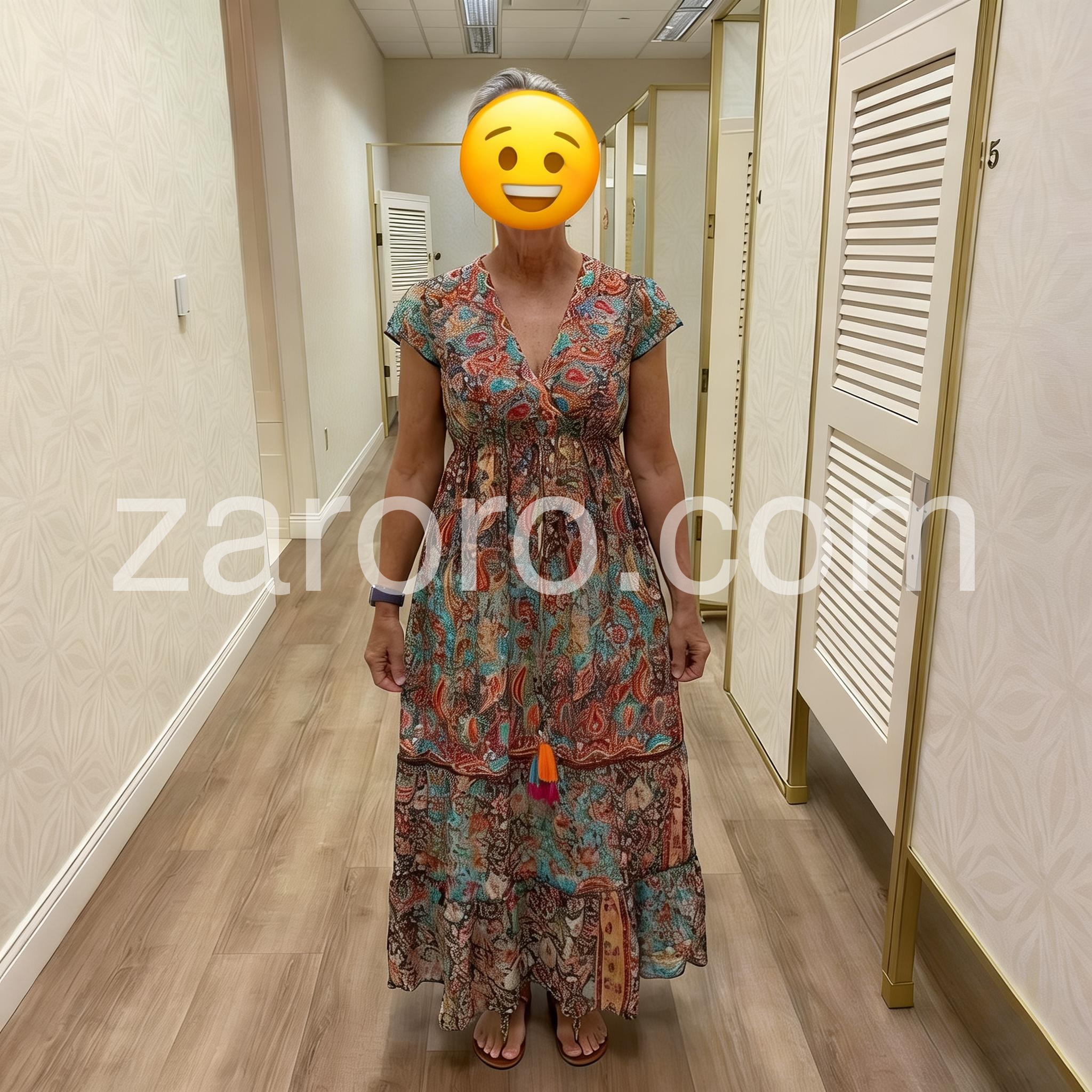 Introducing our elegant and versatile Special Multicolor V-Neck Maxi Dress. Crafted with a flattering v-neck design and made with high-quality material, this dress is perfect for any occasion. With a stunning multicolor pattern, this dress is sure to make a statement. Elevate your wardrobe with this must-have piece.