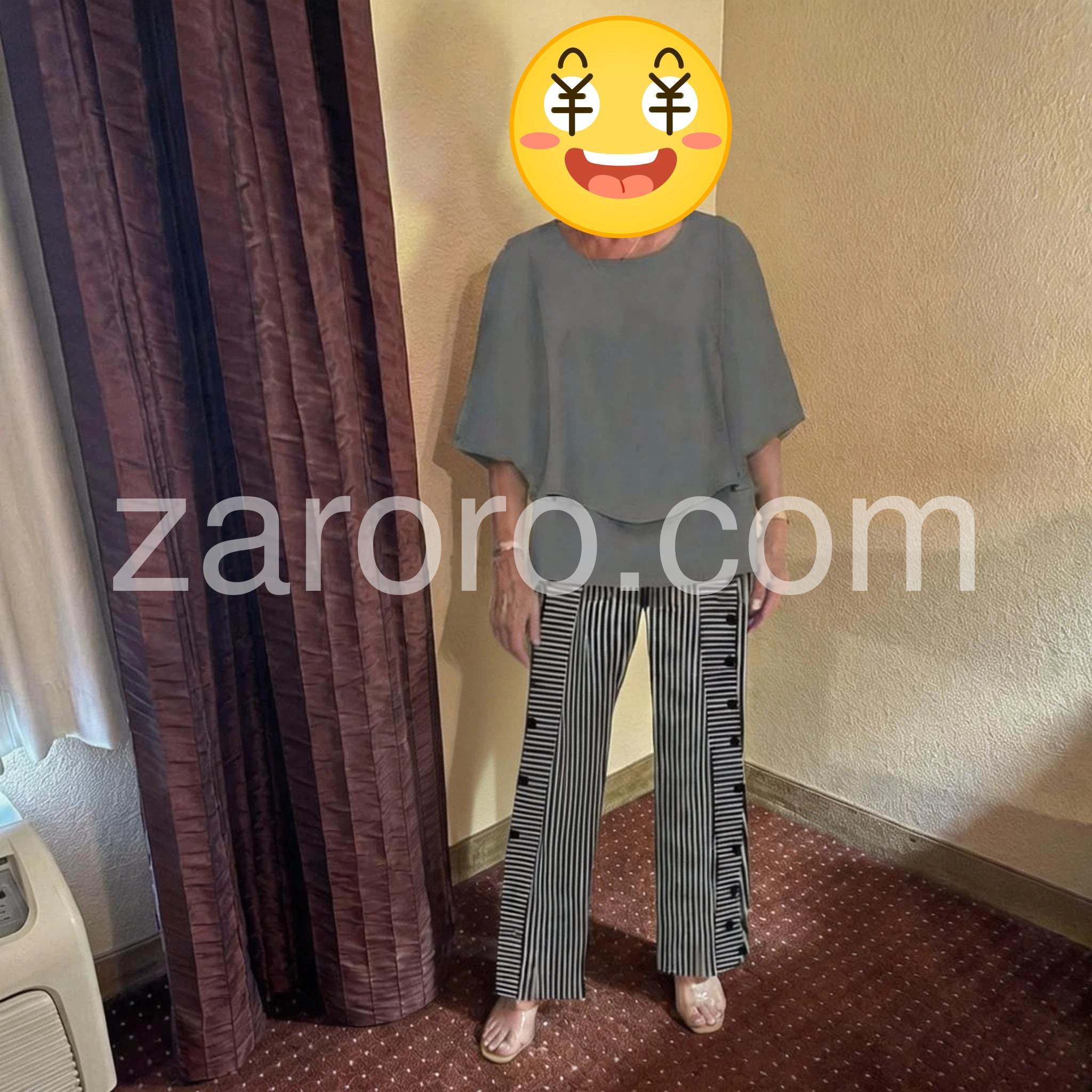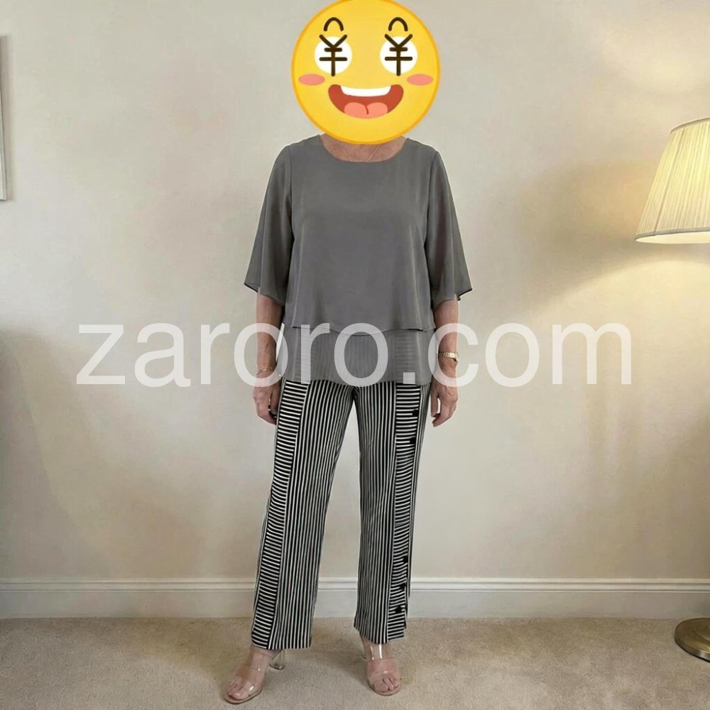 I absolutely love this two-piece set! The grey top is incredibly flattering and hides any tummy imperfections with its layered design. The striped pants are so stylish with the side buttons. Highly recommend for a comfortable yet chic look.