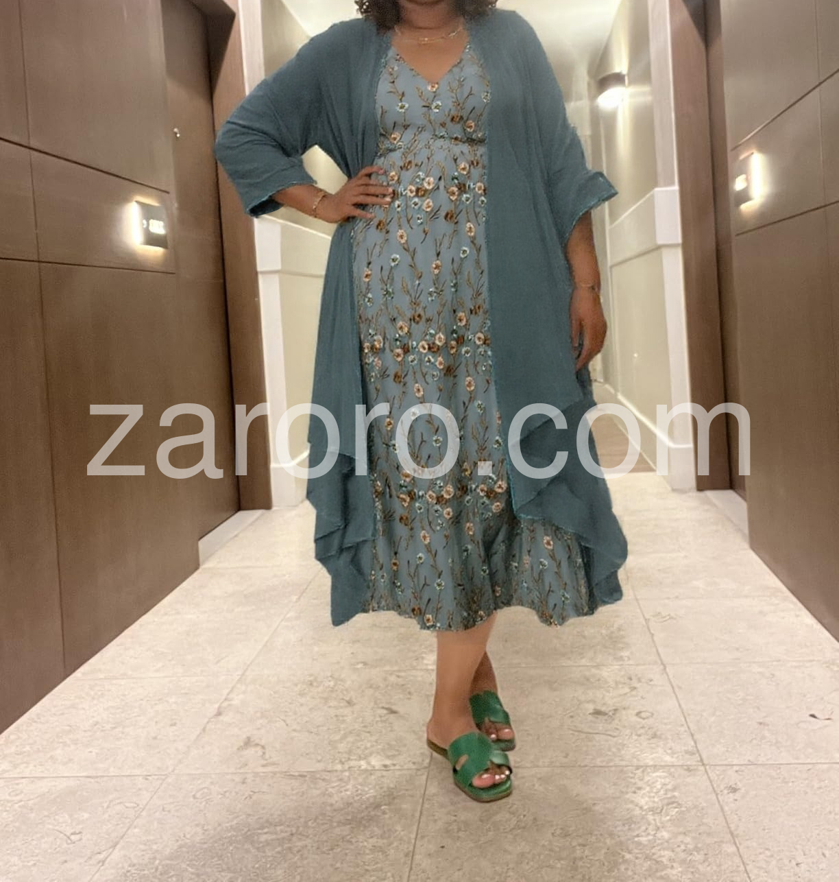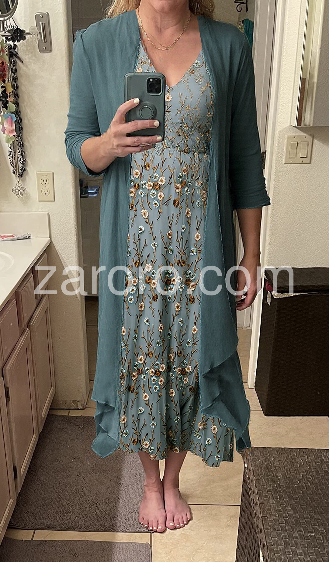 Absolutely gorgeous dusty blue color. The matching cardigan makes it perfect for evening events or cooler nights. I felt so elegant wearing it to dinner!