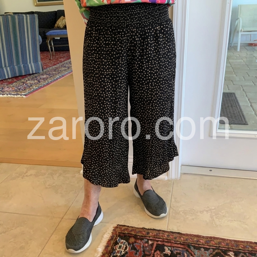 These high-waisted culottes feature a black base with tiny white polka dots. Wide-leg design with ruffled hem for a soft, flared look. Lightweight fabric perfect for warm weather. Ideal for casual outings or relaxed styles. Comfortable and effortlessly chic.