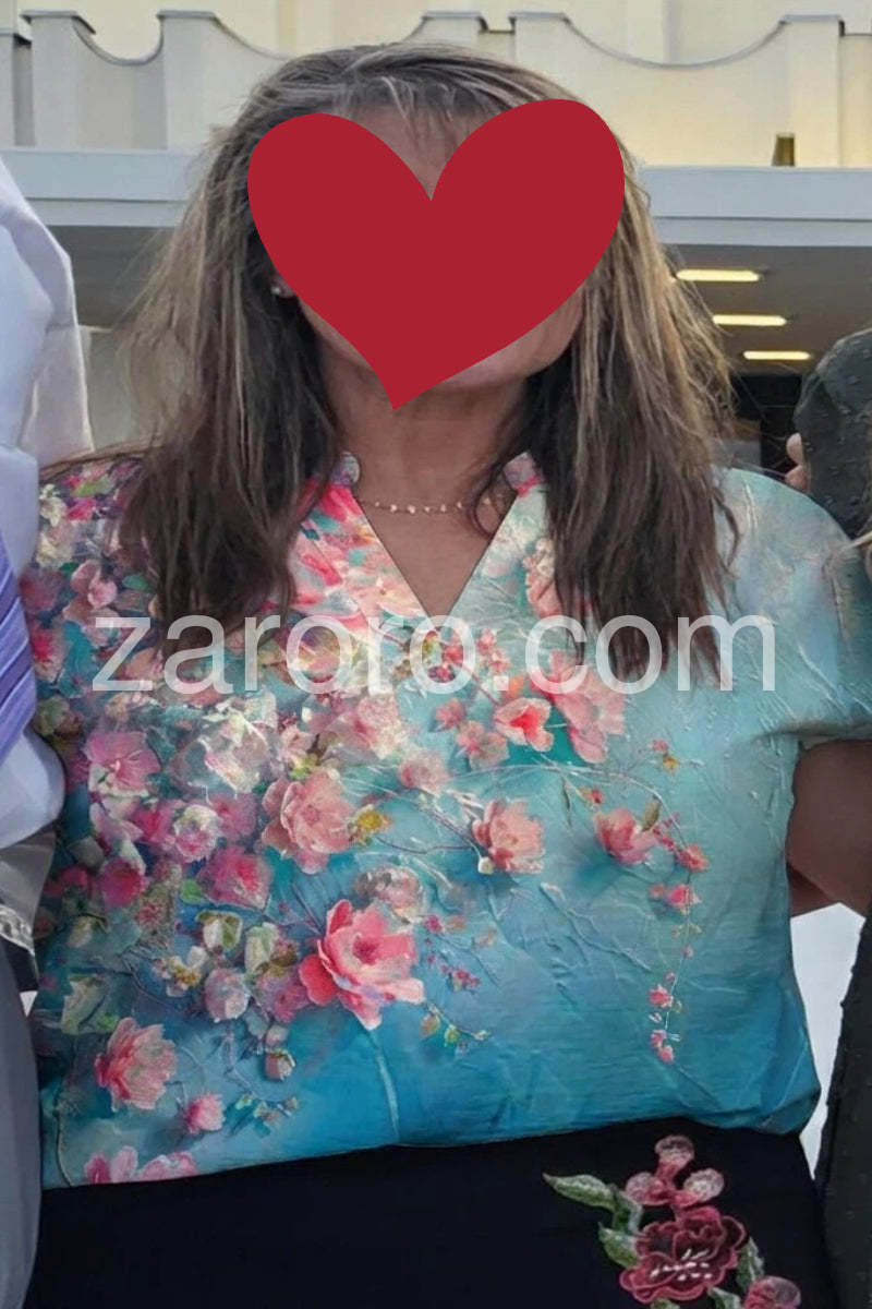 Style# 1544516Bring a burst of elegance to your wardrobe with this Fresh Turquoise Floral Print Top, a stunning piece that blends vibrant floral artistry with luxurious fabric. Crafted from a smooth, satin-like material—likely silk or satin blend—this blouse features a rich turquoise base adorned with a lush watercolor-inspired floral pattern in soft pinks, coral, white, and hints of green. The bold yet romantic design creates a dreamy, garden-fresh look perfect for warm weather. A subtle V-neckline adds a touch of sophistication, while the long sleeves with buttoned cuffs offer versatility and a polished finish. The relaxed, slightly flowy silhouette drapes beautifully over the body, making it ideal for pairing with jeans, tailored pants, or high-waisted skirts. Styled here with denim and layered jewelry, it effortlessly balances casual comfort with refined style. Whether you're heading to a daytime event, brunch, or a summer outing, this floral blouse brings grace, color, and timeless charm to every look.