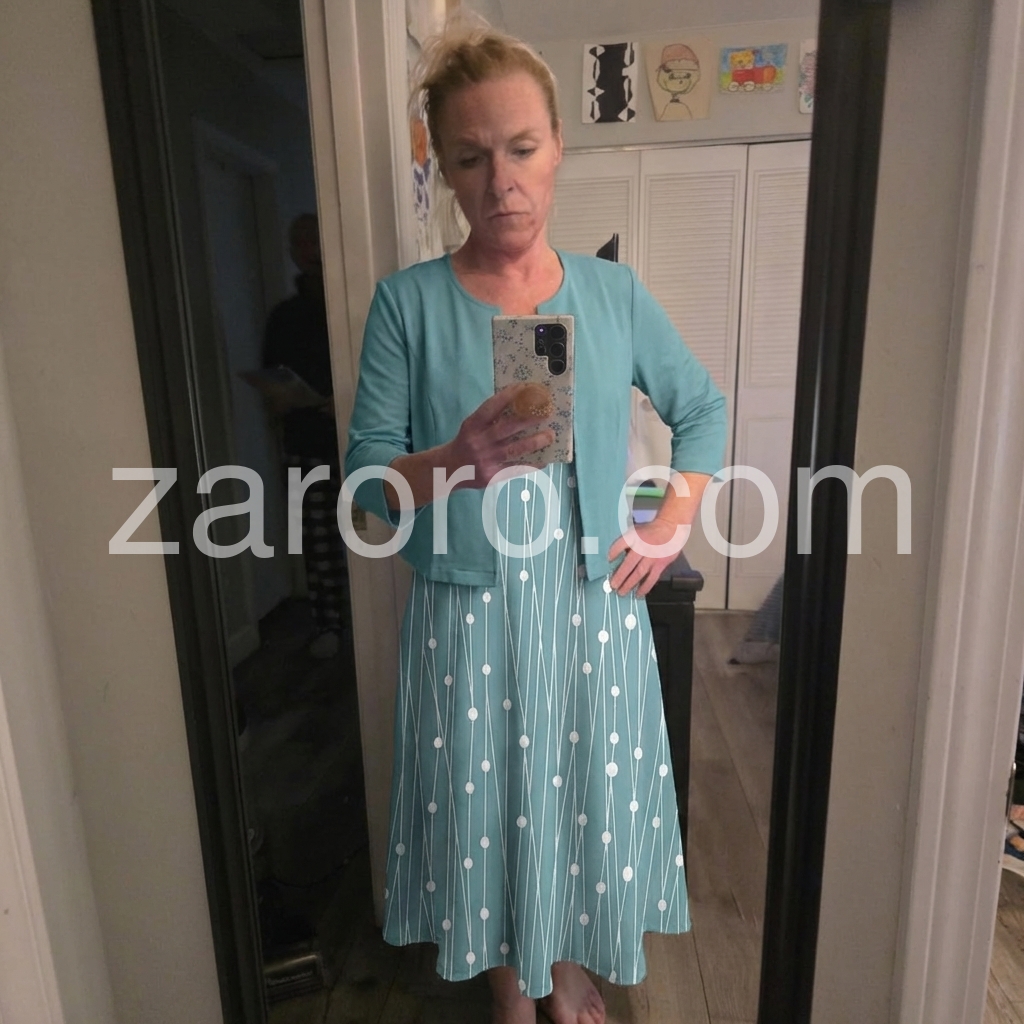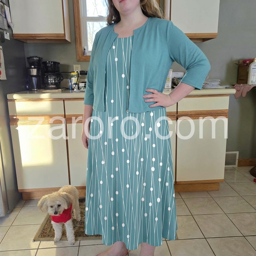 This flowing midi dress with white polka dots on a turquoise background. Paired with a matching short sleeve jacket for a polished look. Comfortable and stylish for casual outings or garden events. Lightweight fabric perfect for warm days. Effortlessly chic and feminine.