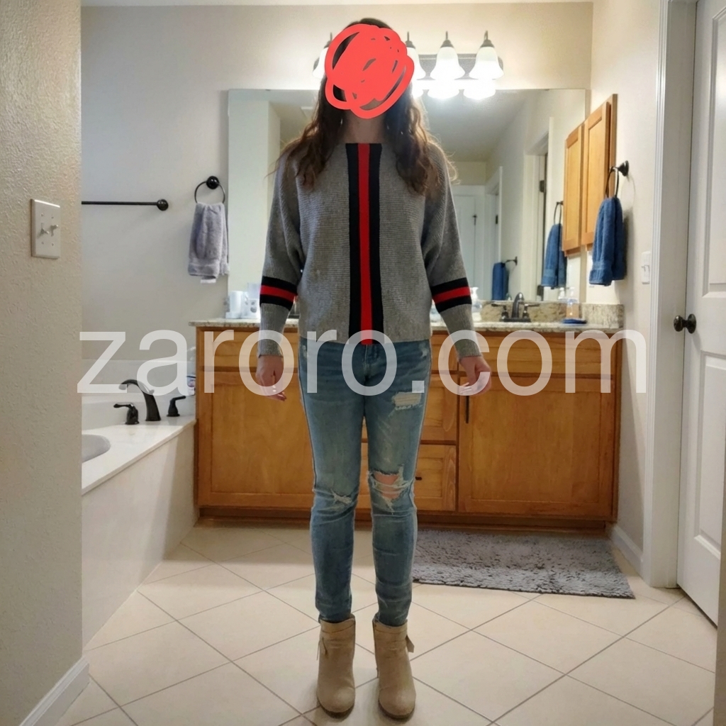 Awesome Free People look-alike sweater! The red lines make it unusual, It’s soft ribbed material! So fashion and comfortable! So versatile! TTS, wearing small. I’m size 4, 5’4”.