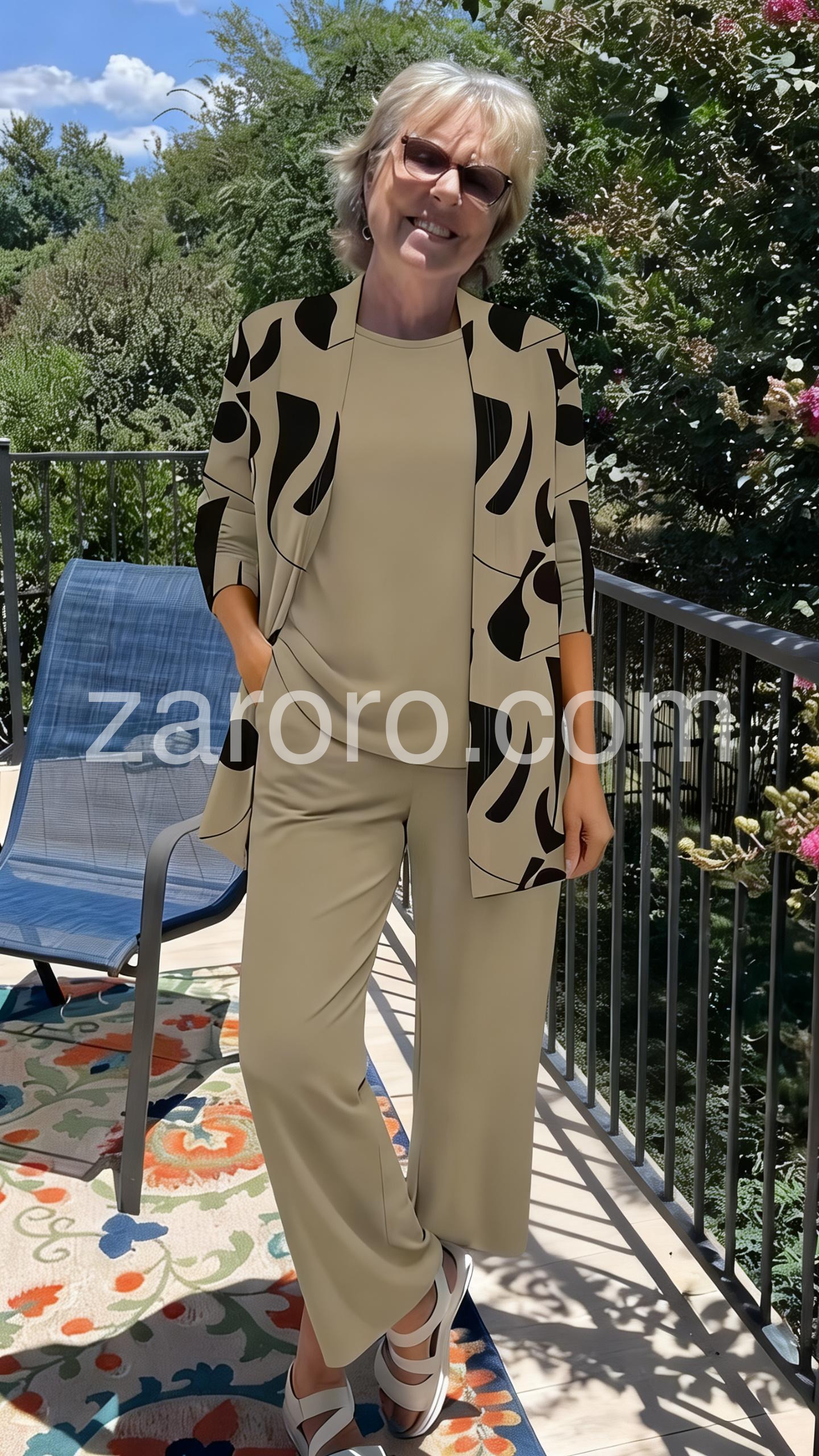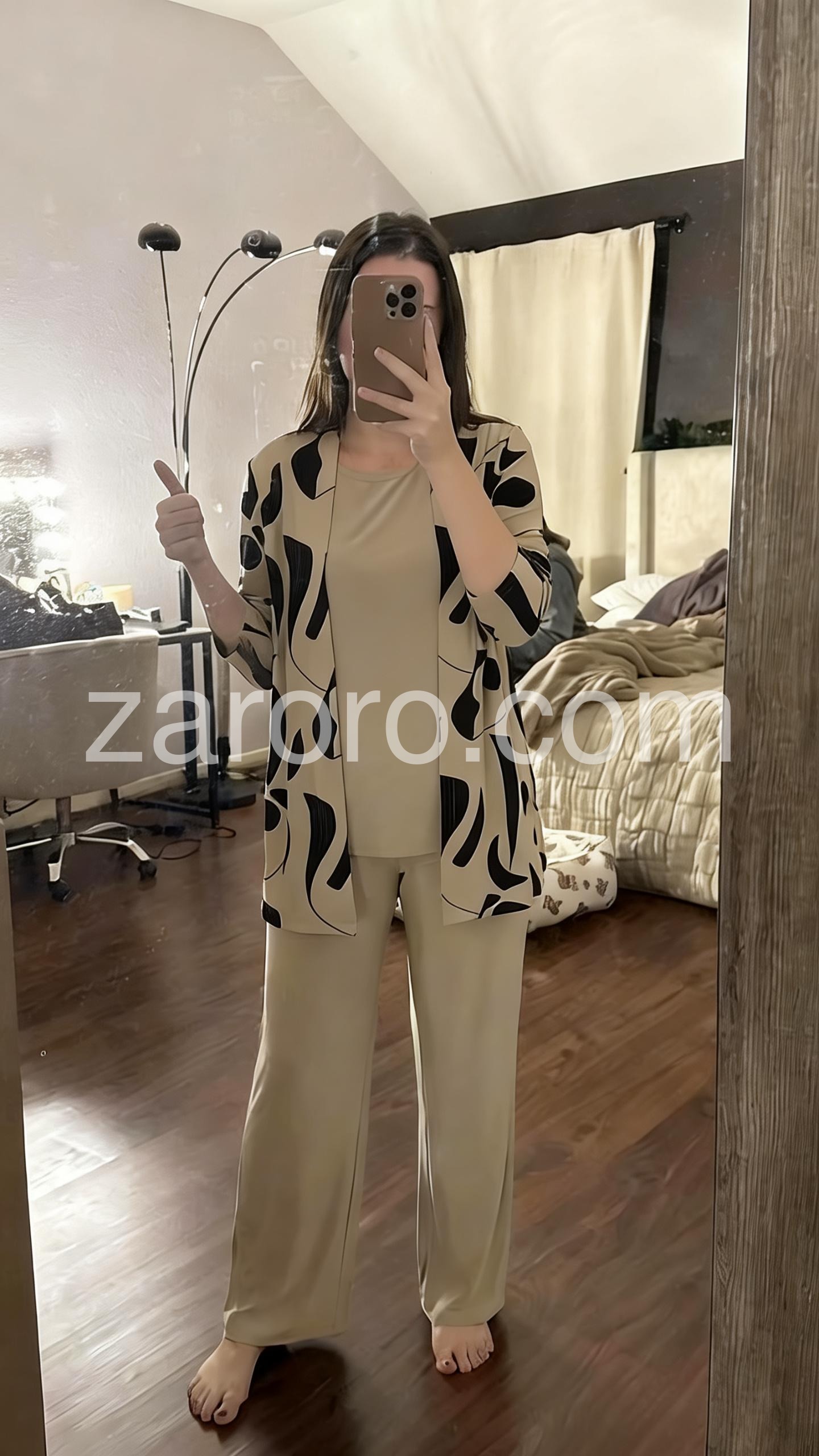 This coordinated set includes a round-neck top, relaxed wide-leg pants, and a matching open-front cardigan in soft brown tones. Made from comfortable, lightweight fabric ideal for everyday wear. The minimalist design offers effortless elegance. Perfect for casual outings or relaxed days at home. Stylish, versatile, and easy to layer.