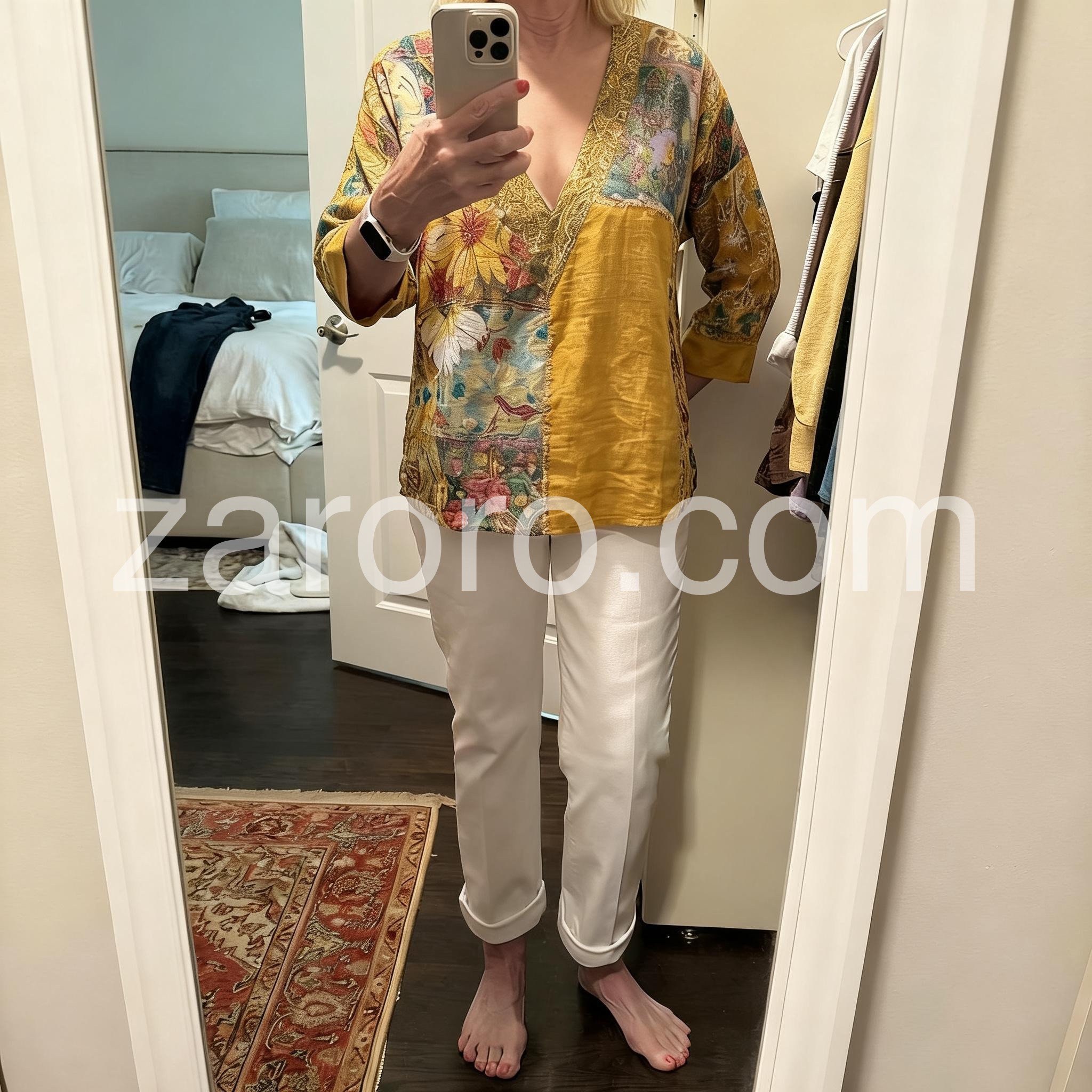 This bohemian top features a bold patchwork design with floral and vintage-inspired prints in warm mustard, blue, and red tones. The deep V-neckline and three-quarter sleeves add flair and comfort. Lightweight fabric ensures ease of movement. Perfect for casual outings or festival wear. Stylish and unique with a free-spirited vibe.