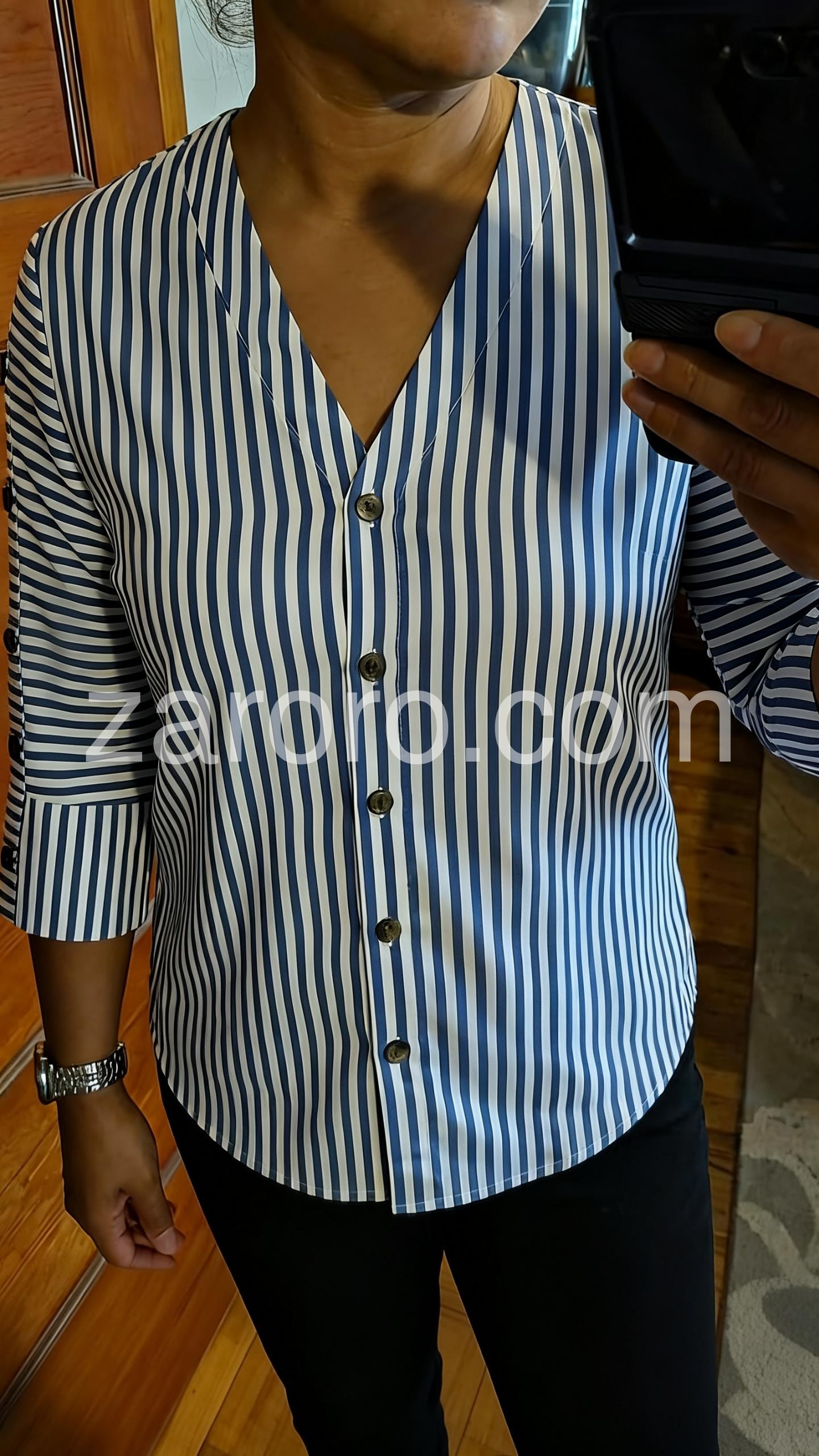 Absolutely love this top! The vertical blue and white stripes are so slimming and the V-neck is just the right depth. It looks great paired with my favorite jeans for a casual day out. The material feels lightweight and breathable too.