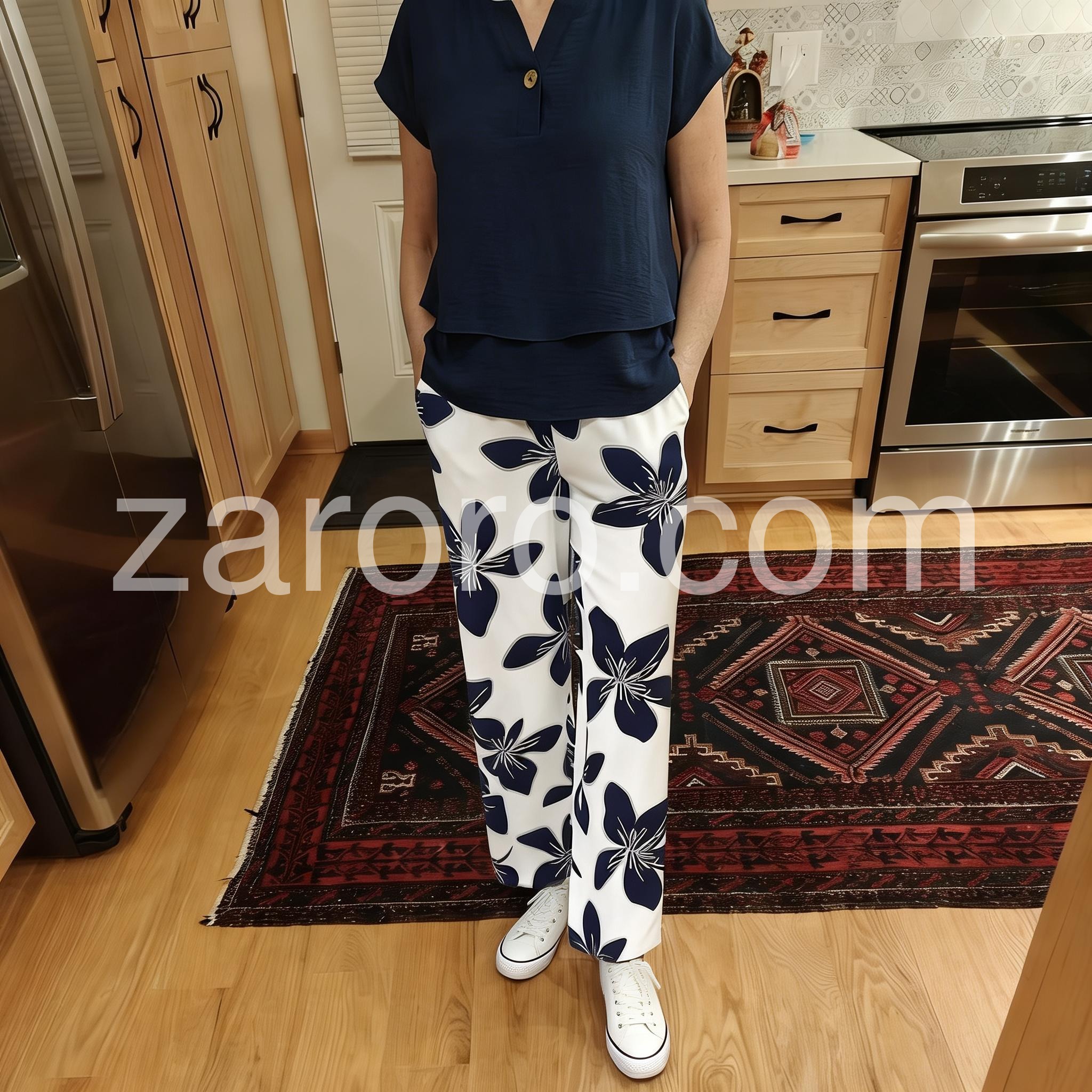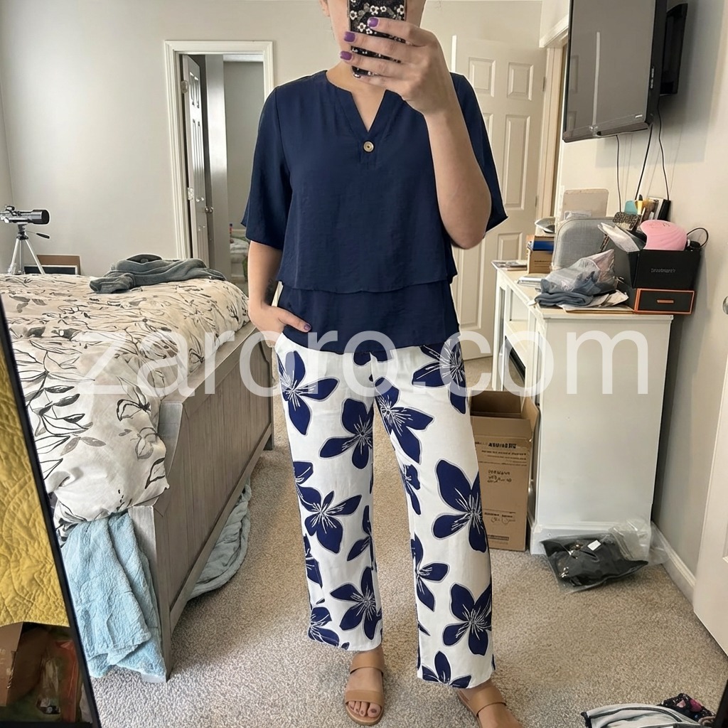 This coordinated set features a relaxed navy top with a layered hem and a single-button detail. Paired with white pants in bold navy floral prints for a beach-ready look. Lightweight fabric perfect for warm weather. Ideal for resort wear or casual outings. Effortlessly elegant and easy to style.