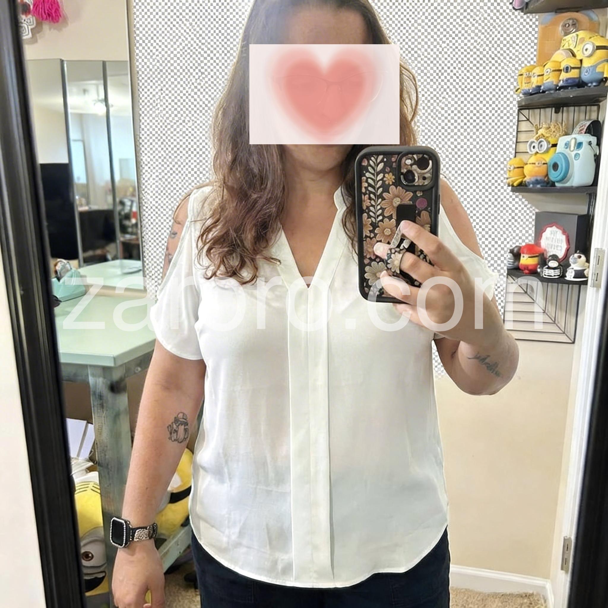 This shirt really flatters my figure. I love loose-fitting shirts, and even though the fabric is a bit thin, it has a great texture. Plus, it always makes me feel like it’s hiding my flaws—really.