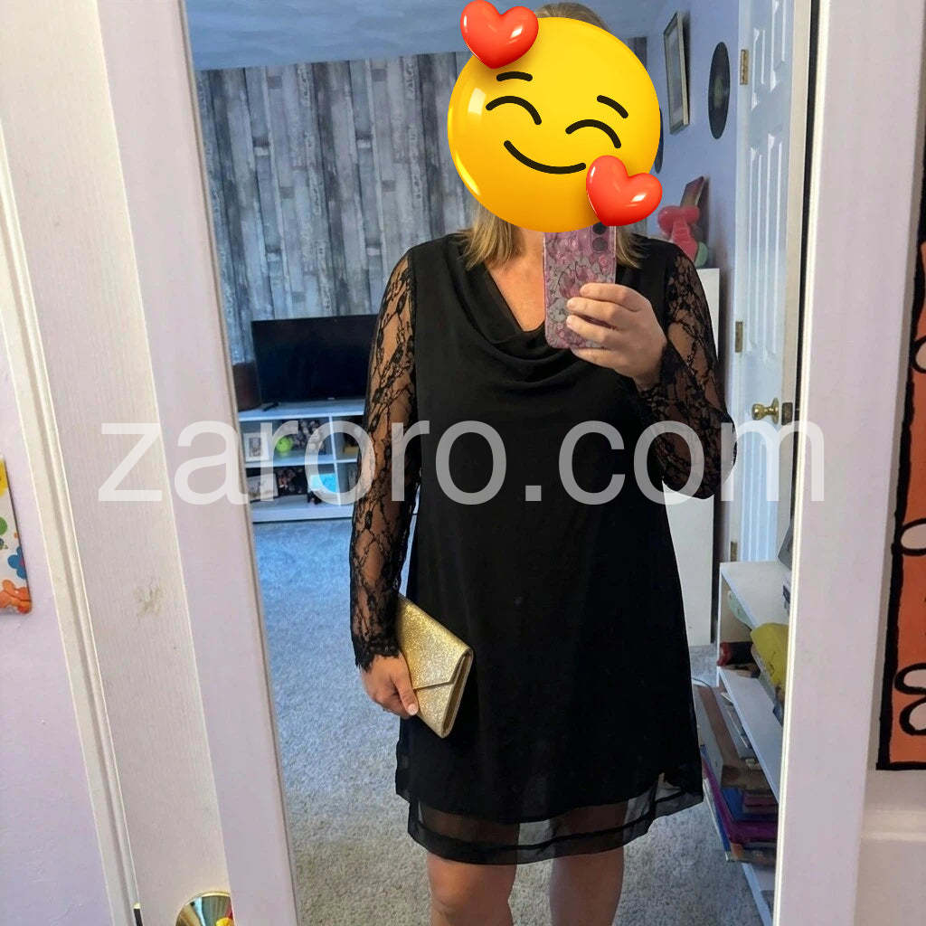 This dress is effortlessly chic and flattering. The lace sleeves add a delicate, feminine touch, while the solid black fabric keeps it versatile for both day and evening events. The length and drape are comfortable, and pairing with a gold clutch elevates the look nicely. Quality feels premium, and the fit is true to size. Fast shipping and friendly customer service completed a smooth shopping experience. Highly recommended for a polished, classic style.