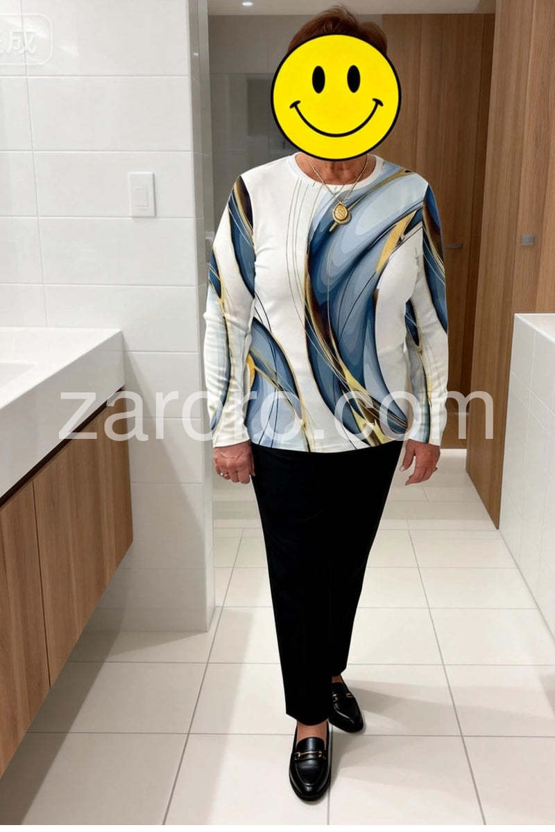 I absolutely adore this top! The abstract design in shades of blue, white, and gold is so eye-catching and unique—it adds a perfect pop of artistry to any outfit. I paired it with black pants and shoes, and it looked effortlessly chic for a casual day out. The colors are versatile enough to dress up or down, making it a great addition to my wardrobe.Love the style.