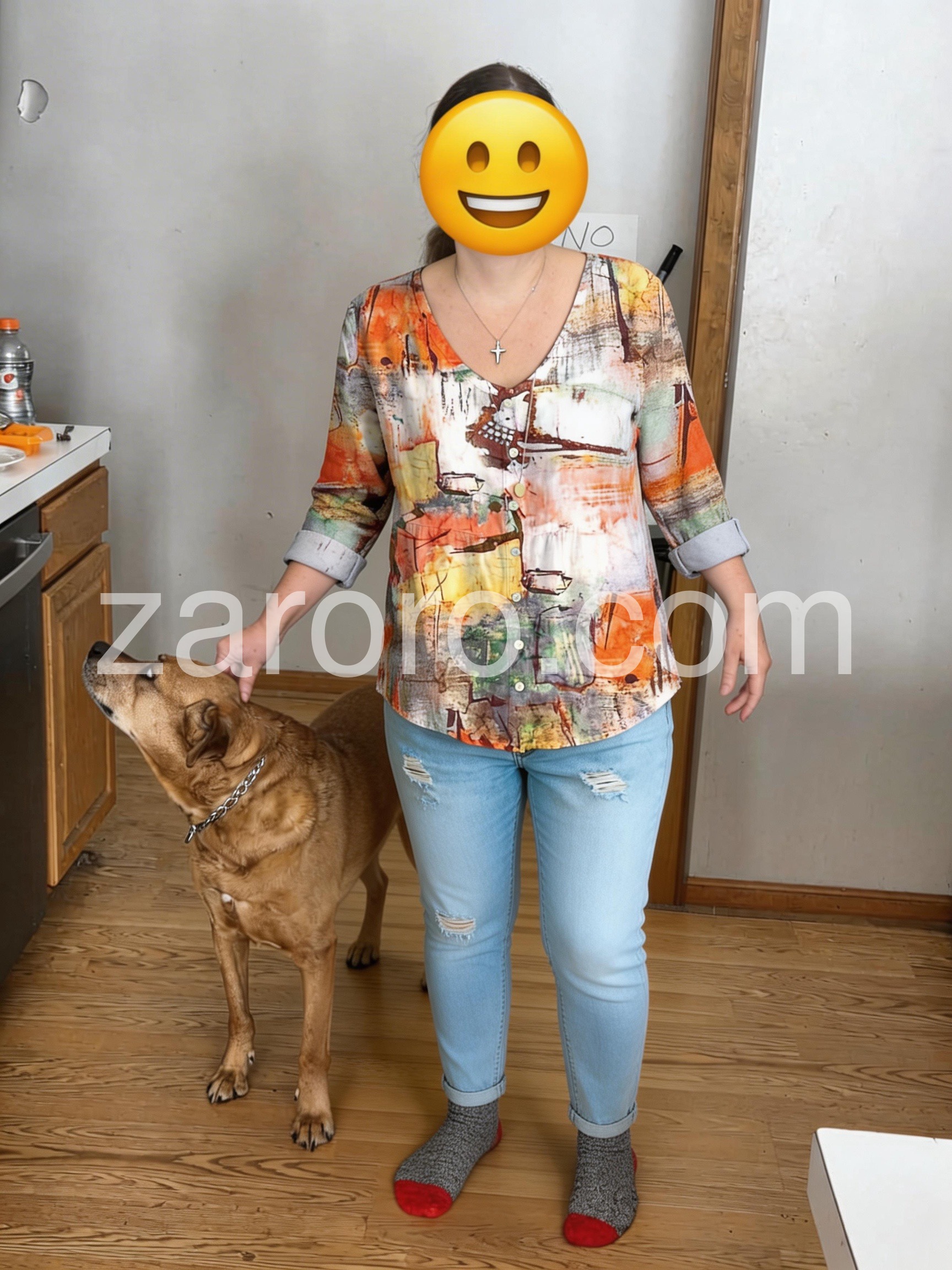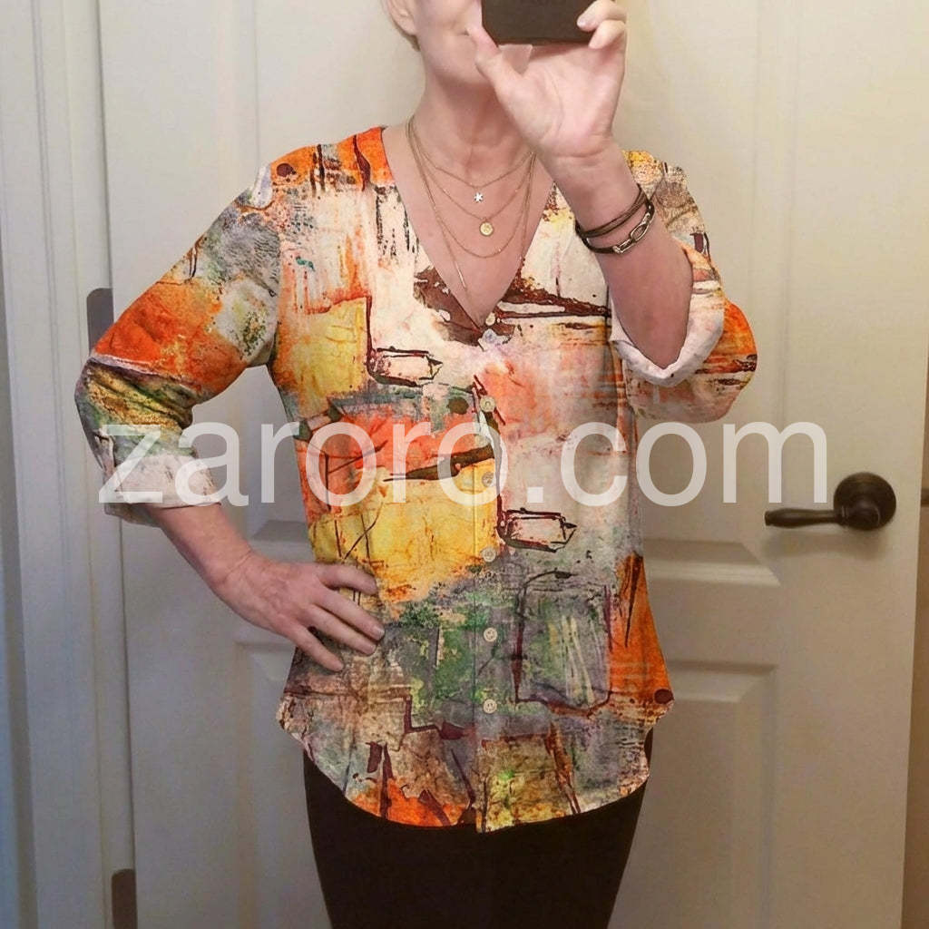 Style# 1544471Make a bold fashion statement with this Chic Abstract Watercolor Print Top, a one-of-a-kind top that turns wearable art into everyday elegance. Crafted from soft, lightweight fabric—likely cotton or rayon blend—this blouse features a vibrant, painterly design inspired by watercolor strokes and abstract expressionism. The print blends warm tones of orange, rust, mustard, teal, and cream, creating a dynamic and artistic look that’s both eye-catching and sophisticated. Styled here with distressed denim and layered jewelry, it’s ideal for weekend outings, creative gatherings, or adding a burst of personality to your daily wardrobe. Whether you're heading to brunch or exploring the city, let this abstract-print top elevate your style with creativity, comfort, and boho flair.