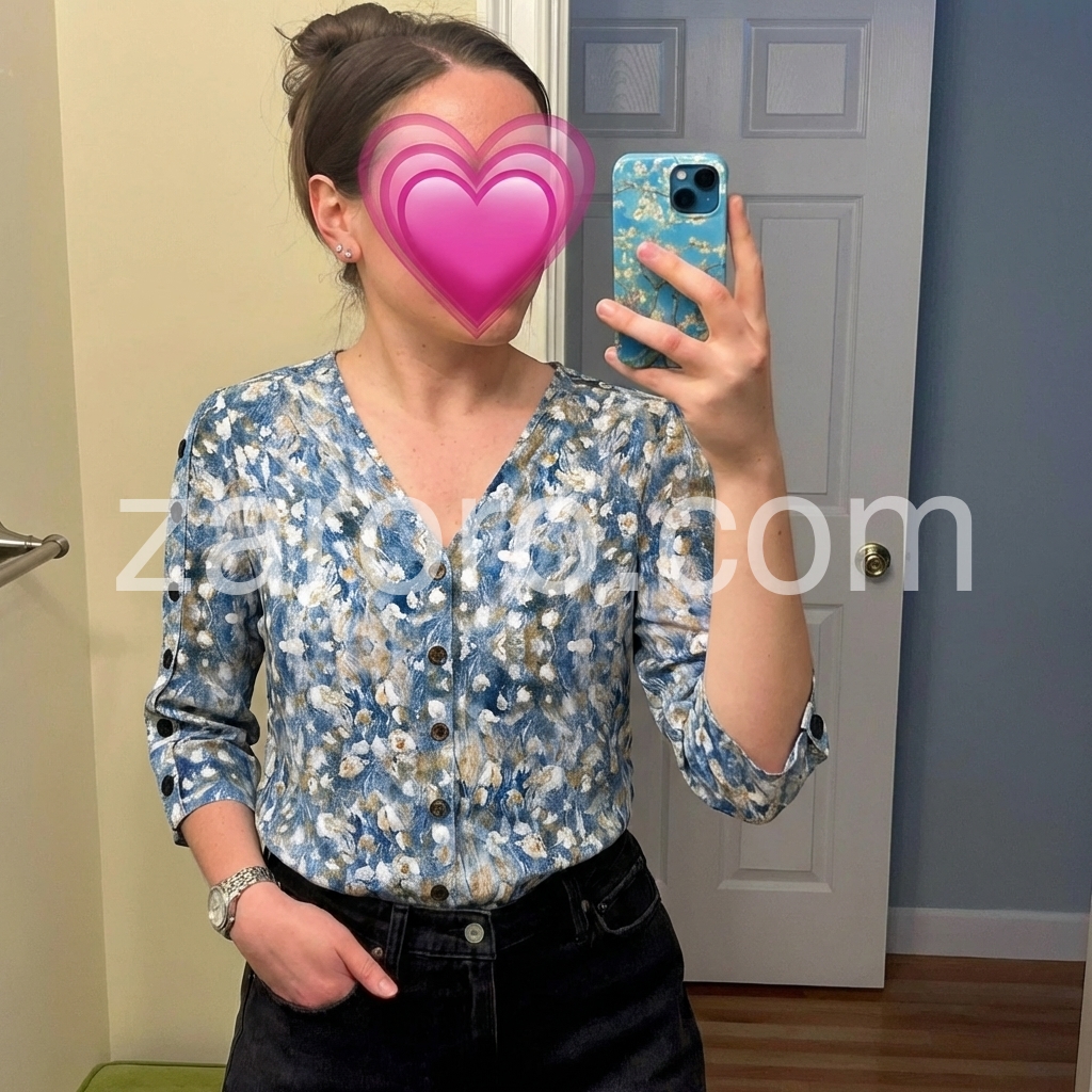 This artistic blouse features a stunning oil-painting floral print and trendy side buttons. The V-neck and 3/4 sleeves create a flattering, modern silhouette.