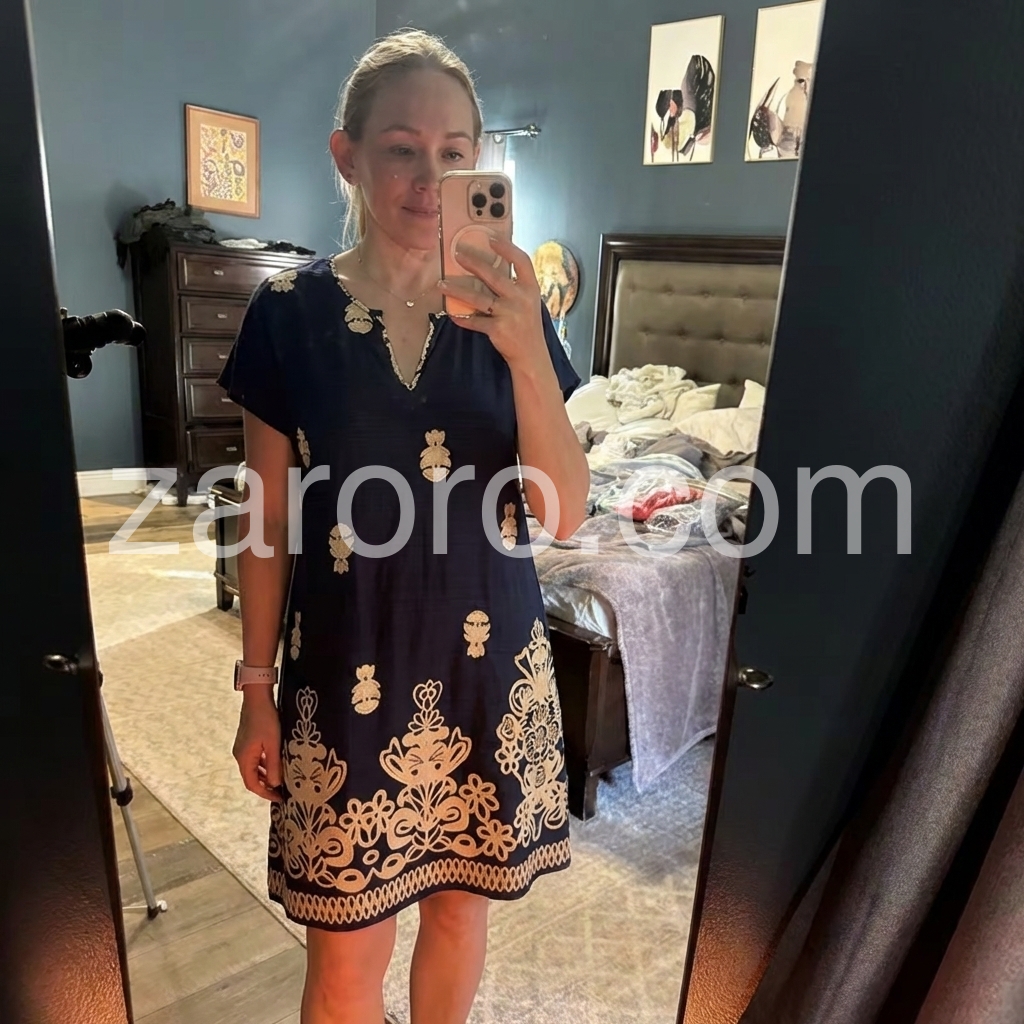 Slip into summer bohemia with this stunning navy shift dress. It features intricate cream embroidery and a relaxed V-neck fit, blending artisanal charm with everyday ease.