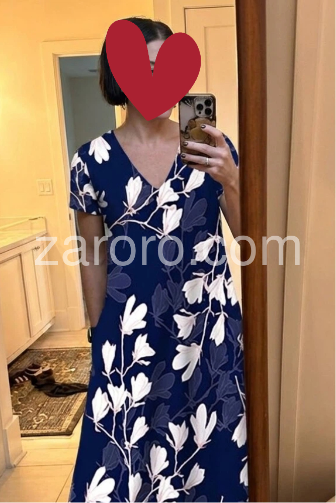 This flowing midi dress features a deep navy base with white floral prints. V-neckline and short sleeves for a flattering fit. Side pockets add practicality and ease. Lightweight fabric perfect for summer days. Ideal for beach outings or casual gatherings.