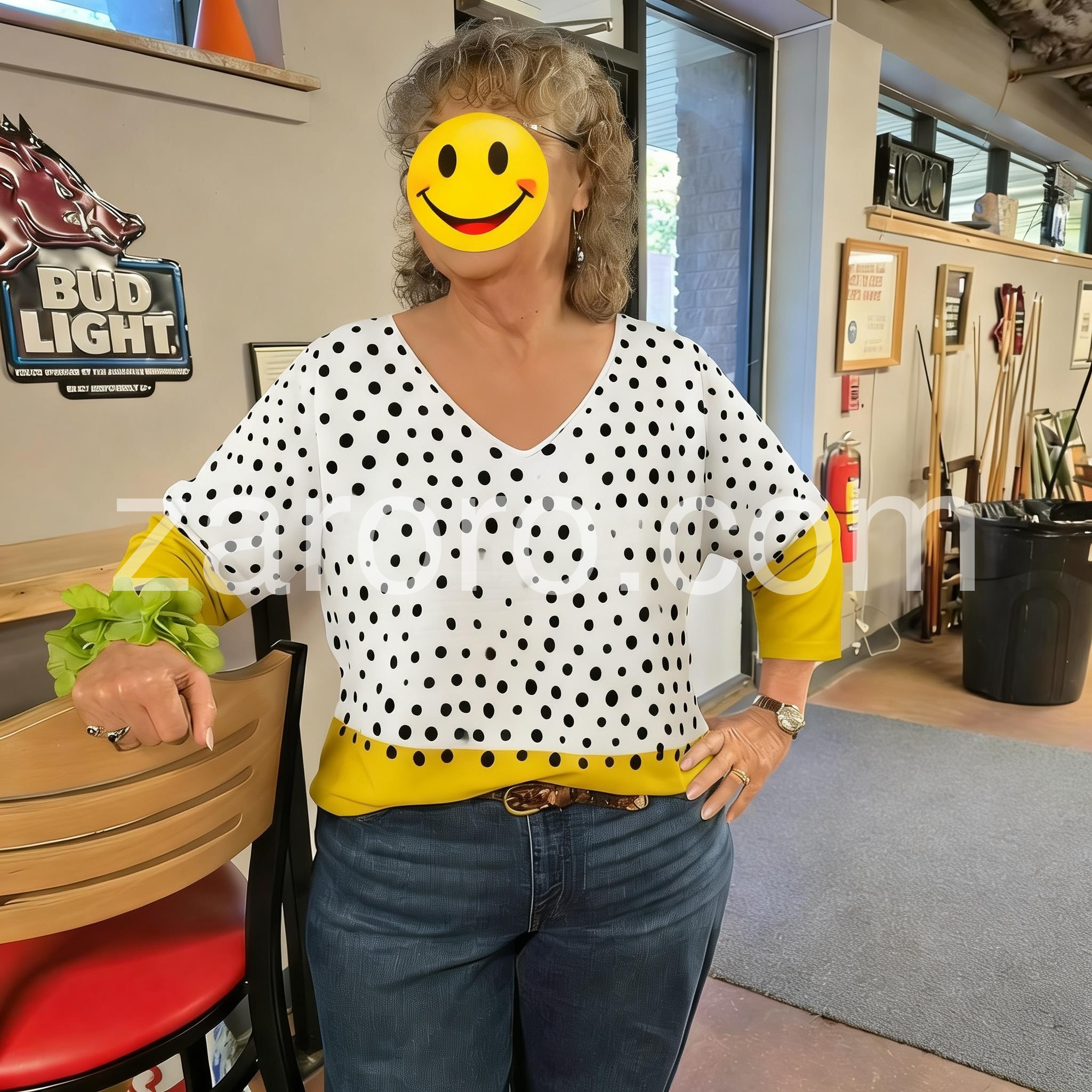 This relaxed-fit top features a white base with black polka dots and a vibrant yellow hem. V-neckline and three-quarter sleeves with rolled cuffs. Lightweight fabric for comfort and style. Perfect for casual wear or adding a pop of color to your outfit. Effortlessly trendy and easy to pair.