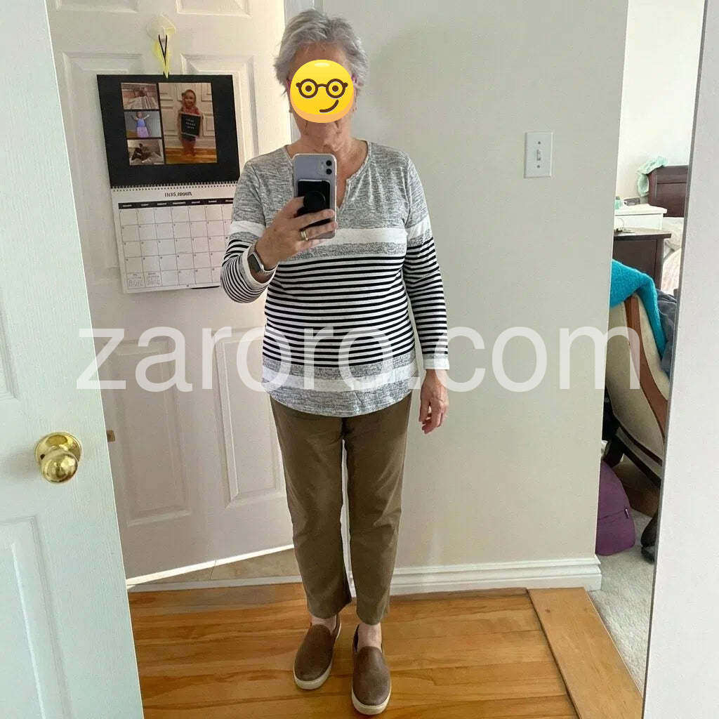 This Youthful Notched Neck Striped Print Long Sleeve Top combines a modern silhouette with timeless style. Designed with a distinctive notched neckline and classic horizontal stripes, it offers a refined yet casual look. The long sleeves provide comfort and versatility, making it a practical choice for layering or standalone wear. Ideal for everyday sophistication, this top complements both relaxed and polished outfits with ease.