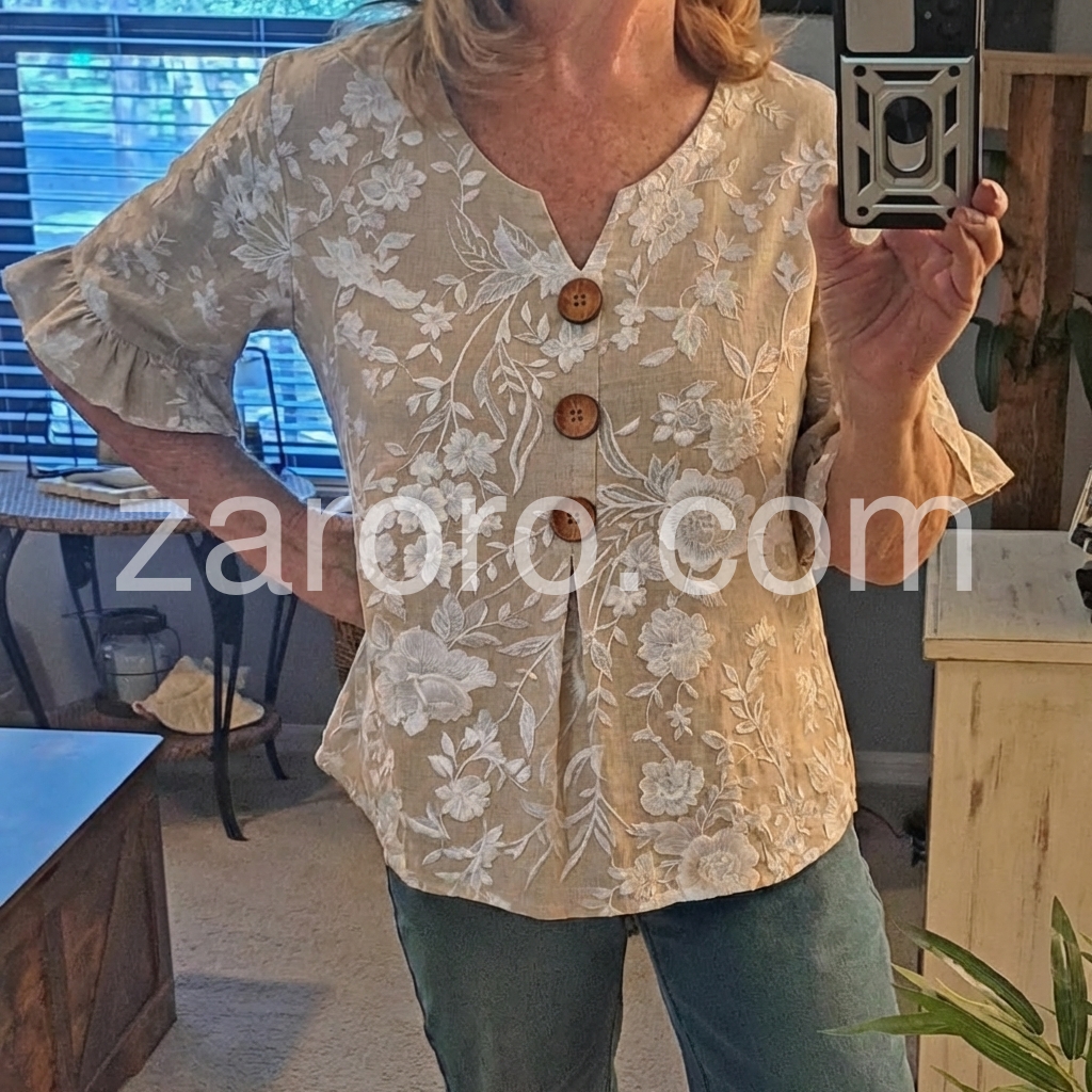 This V-neck top features delicate white floral Print on a soft beige base. Front button closure with wooden buttons and flared ruffle sleeves. Lightweight fabric perfect for warm days. Relaxed fit with a feminine touch. Ideal for casual wear or resort style.