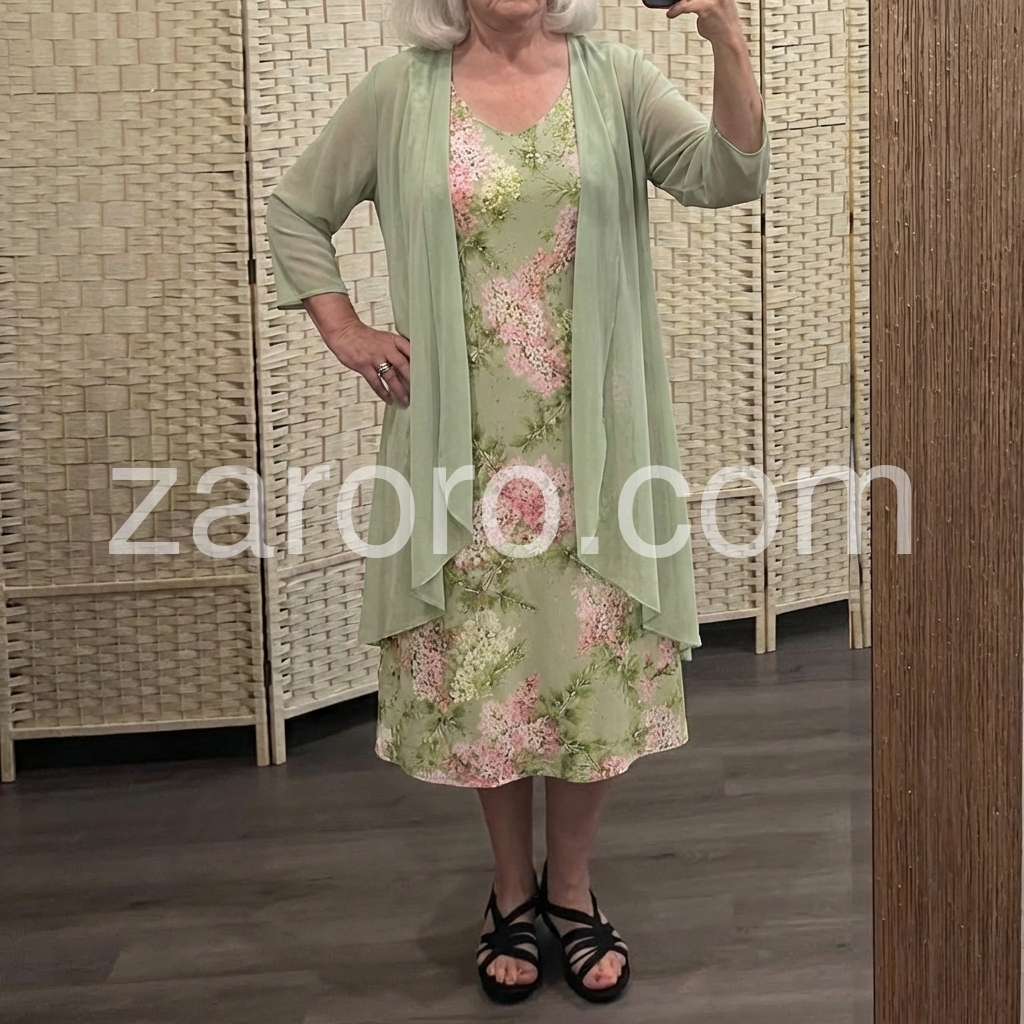 This soft floral dress features a light green base with pink and white blossoms. Paired with a matching sheer duster for a layered look. V-neckline and relaxed fit perfect for warm days. Ideal for garden parties or casual outings. Fresh and feminine style.